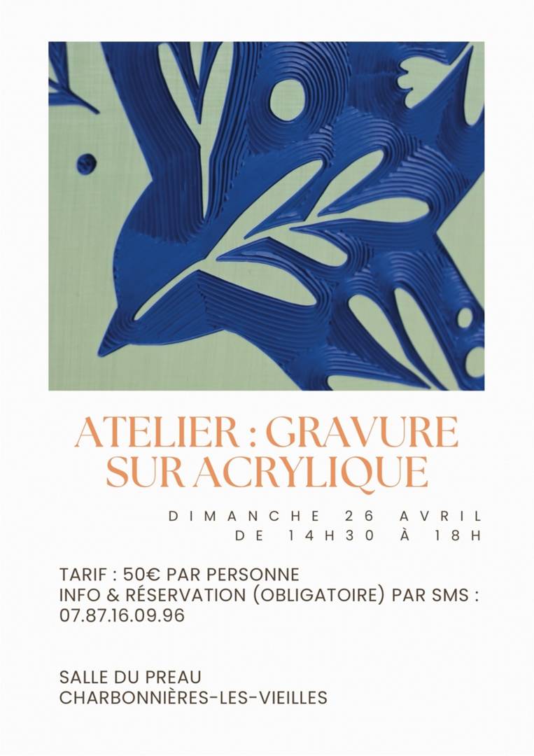 Nous aurons l’honneur d’accueillir l’artiste Bérangère Duflo, dont nous avions déjà eu le plaisir de présenter le travail à la salle du Conseil Municipal il y a quelque temps. Artiste plasticienne, elle explore la matière et les techniques avec une approche sensible et expérimentale. Lors de cet atelier, elle vous accompagnera dans la découverte de la gravure sur acrylique, accessible à tous.