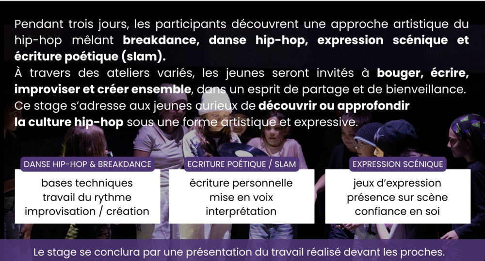 Pendant trois jours, les participants découvrent une approche artistique du hip-hop mêlant breakdance, danse hip-hop, écriture poétique (slam) et expression scénique.