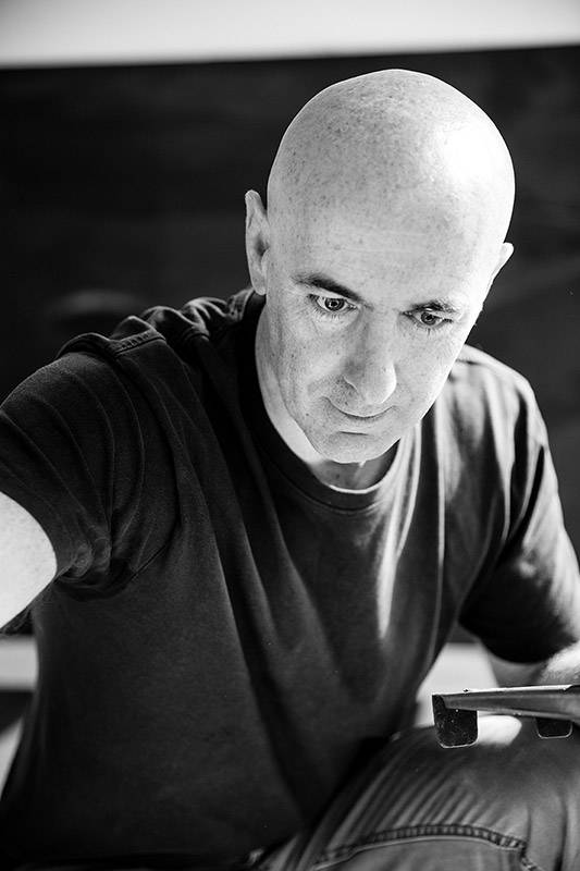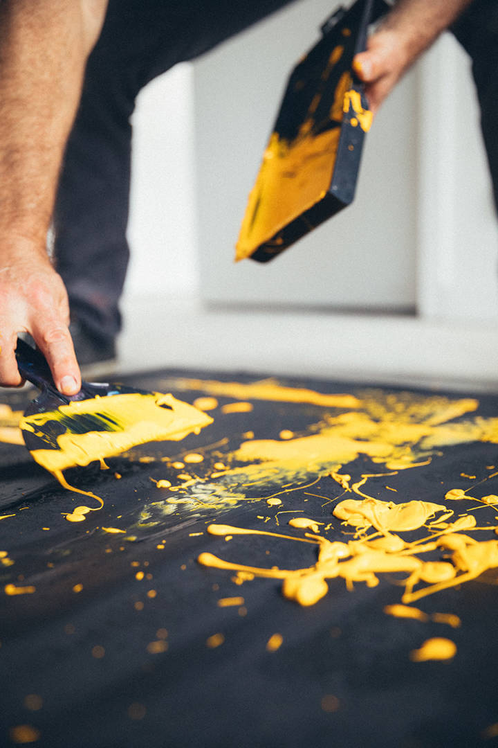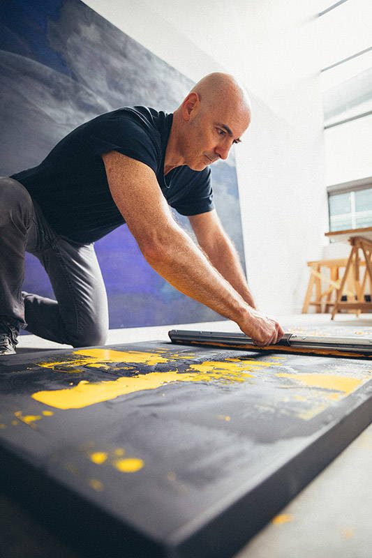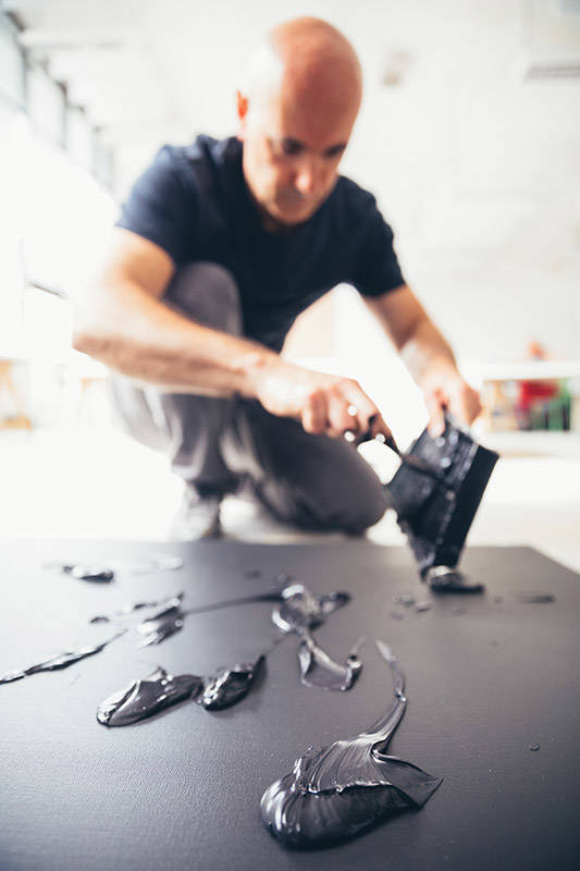 Il explore les émotions laissées par une idée, un lieu, une rencontre… avant de les retranscrire sur toile en détournant l’usage d’outils (outils de