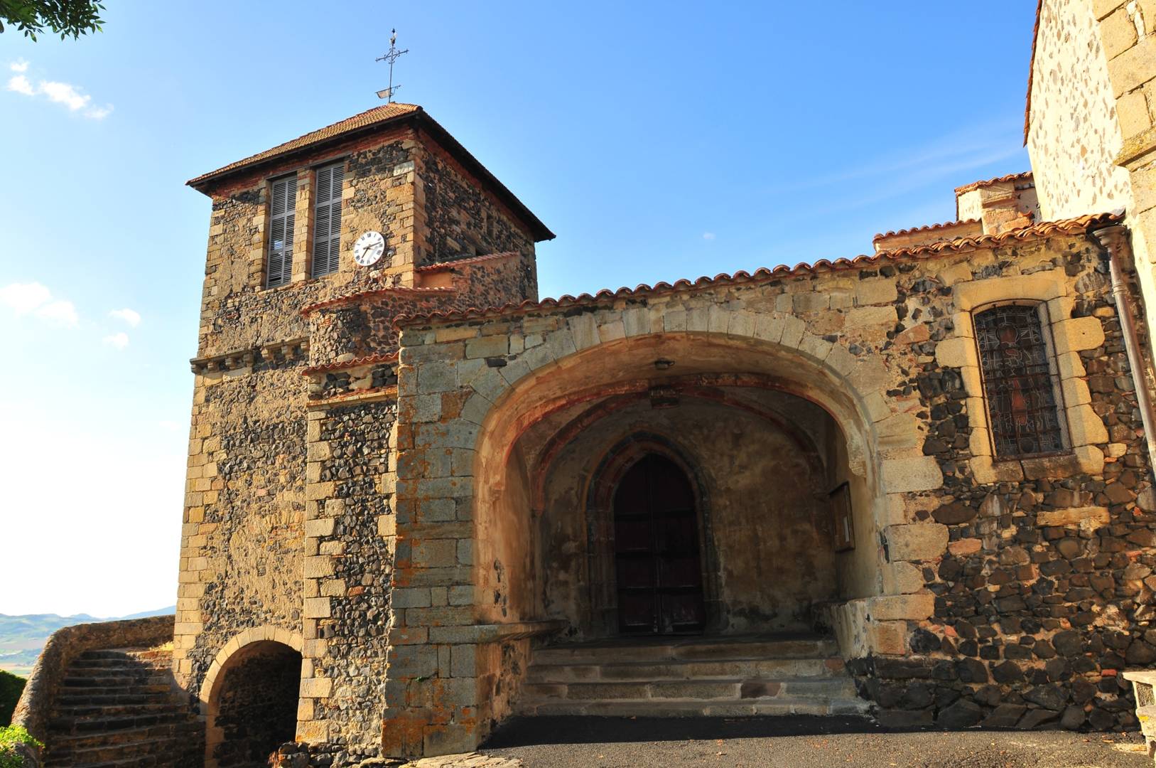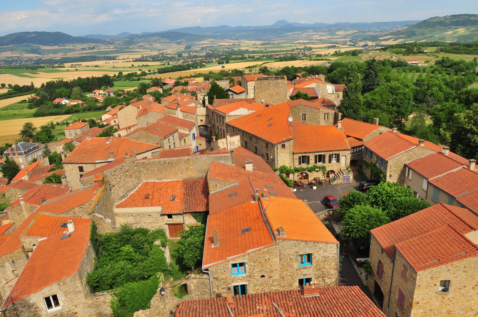 Perché sur une butte volcanique et dominé par une statue de la vierge, le village d’Usson offre un panorama à 360° sur la chaîne des Puys, le massif du Sancy, le Cézallier, les monts du Cantal et ceux du Livradois-Forez.