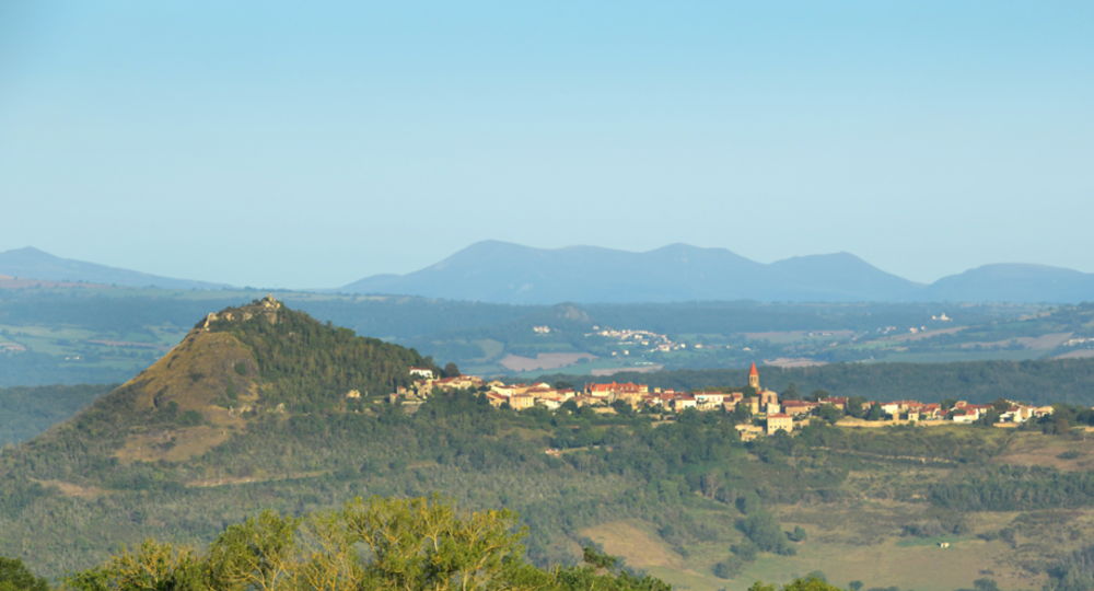 Perché sur une butte volcanique et dominé par une statue de la vierge, le village d’Usson offre un panorama à 360° sur la chaîne des Puys, le massif du Sancy, le Cézallier, les monts du Cantal et ceux du Livradois-Forez.