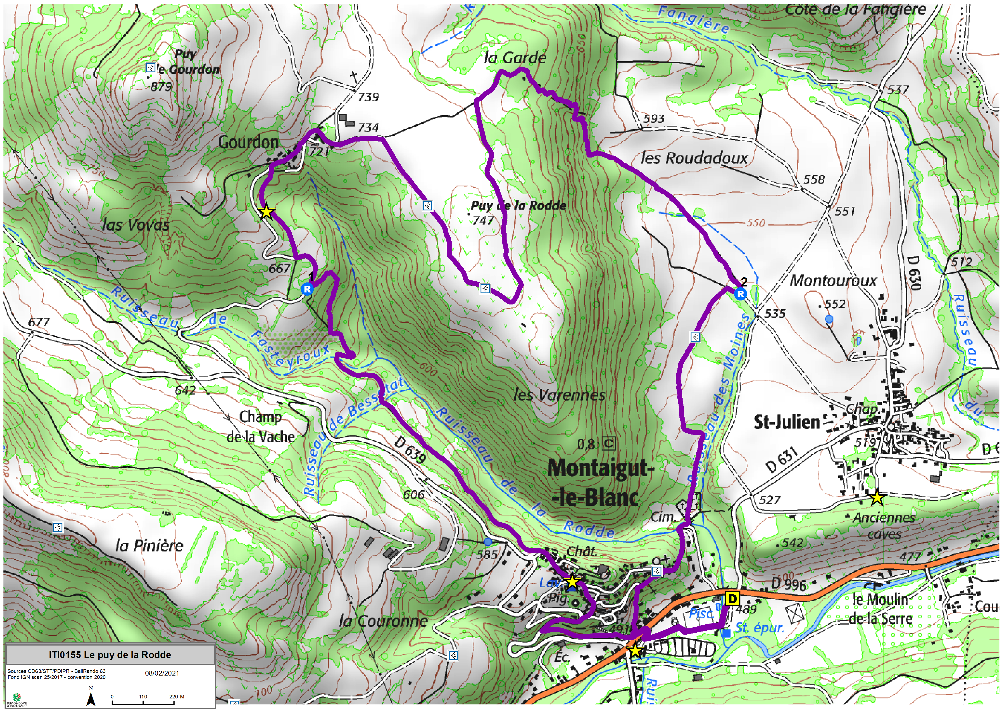 L’agréable vallon de la Rodde mène à Gourdon d’où l’on découvre un vaste panorama sur les plateaux de l’ouest, la plaine de la Limagne et les volcans. Un sentier entre genêts et sous-bois ramène vers les hauteurs médiévales de Montaigut-le-Blanc.