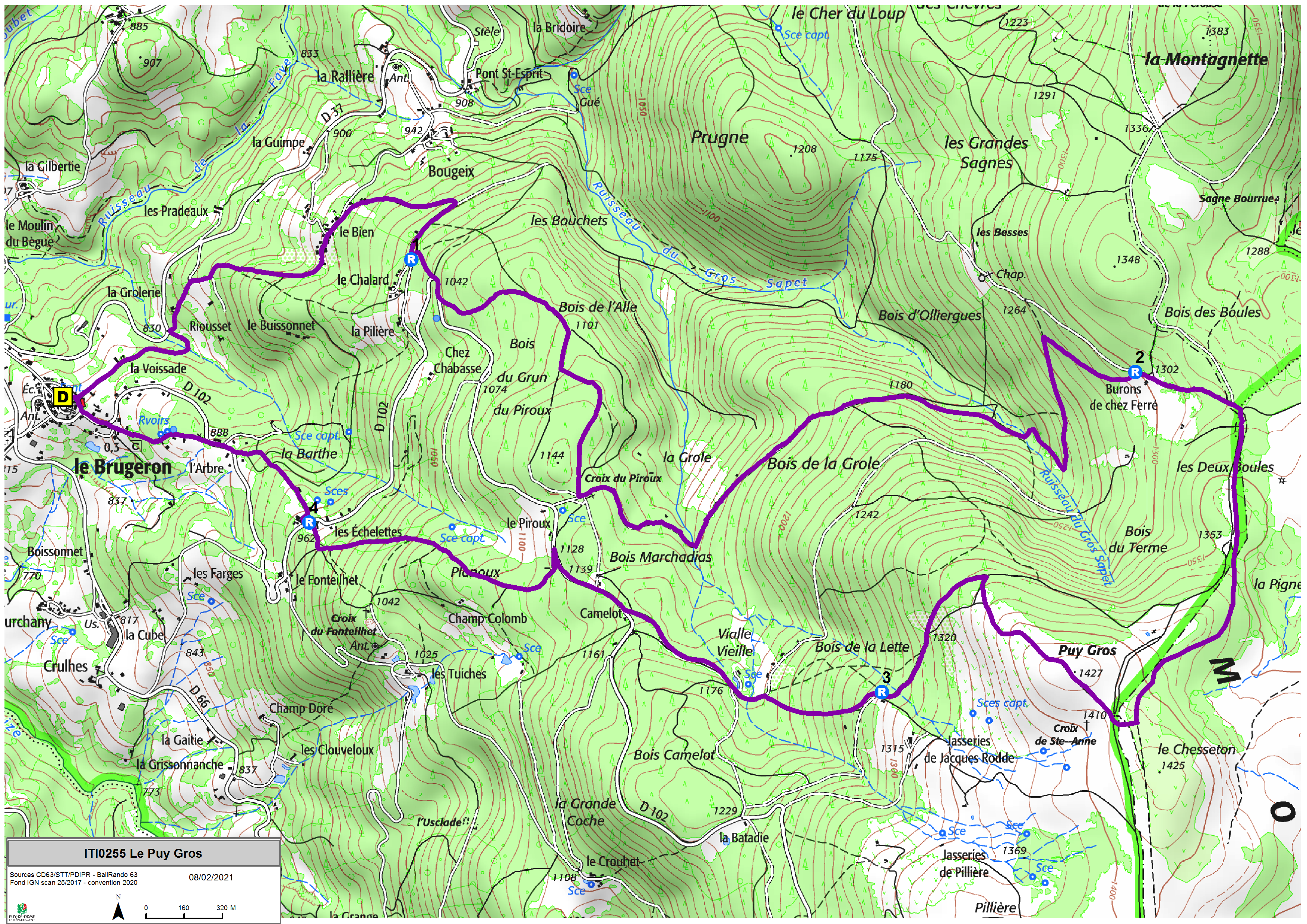 Étape 1 : De l’église du Brugeron, suivre la route à droite et emprunter la route à gauche 50 m avant la D 102. Juste avant la D 37, emprunter le sentier qui monte à droite jusqu’au village de Bien. Traverser le hameau en restant sur la route à droite. À la sortie du hameau, à la patte d’oie, bifurquer sur le chemin de droite. À la piste forestière, l’emprunter à droite jusqu’à la patte d’oie.
