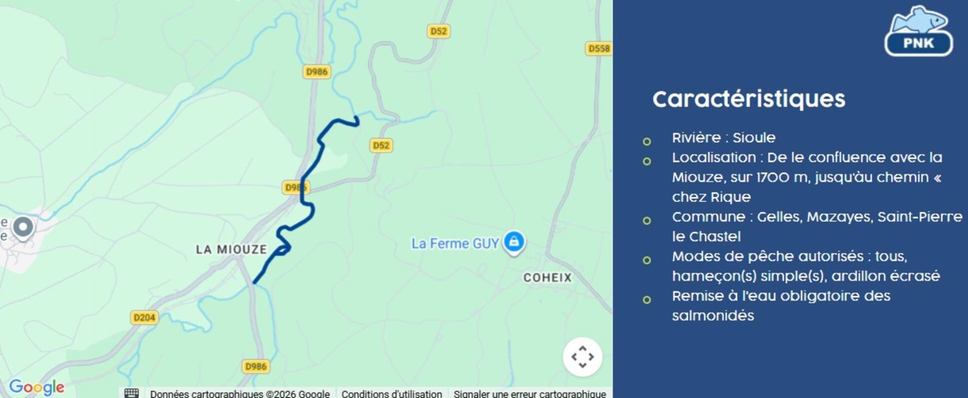 «de la limite amont : confluence avec la Miouze, sur 1700 m, jusqu’au chemin « Chez Rique »
