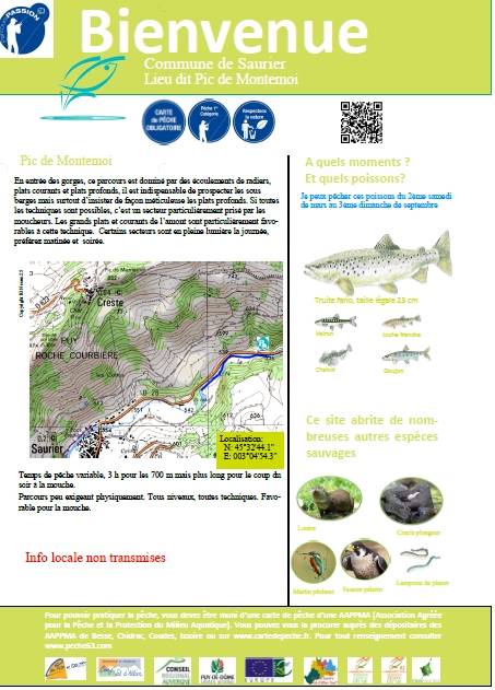 Temps de pêche variable = 3 h pour les 700 m mais plus long pour le coup du soir à la mouche. Parcours peu exigeant physiquement. Tous niveaux, toutes techniques. Favorable pour la mouche.