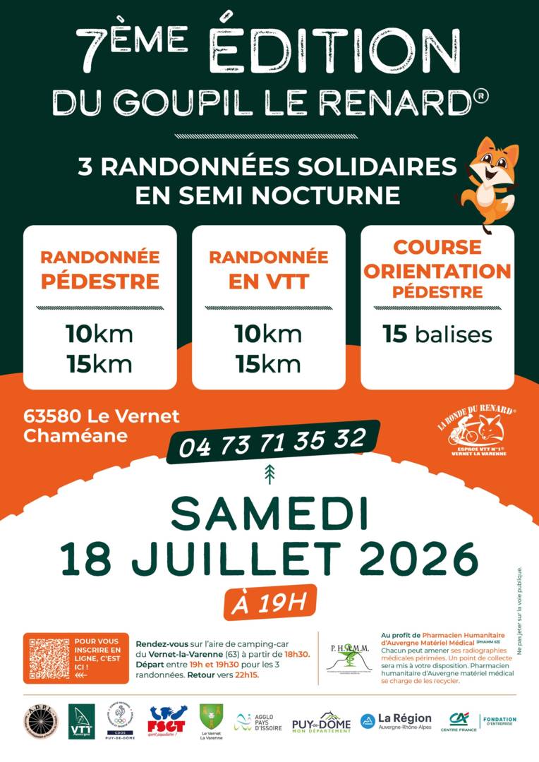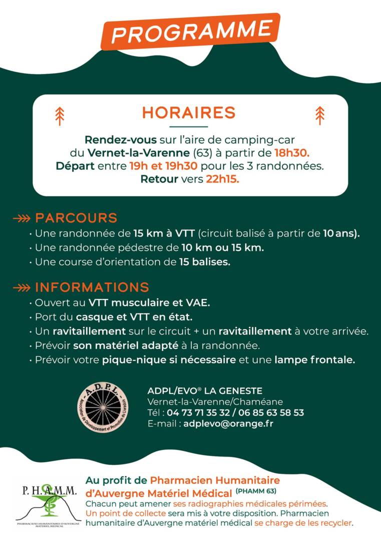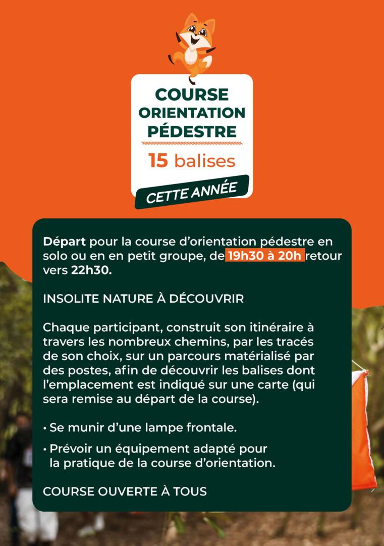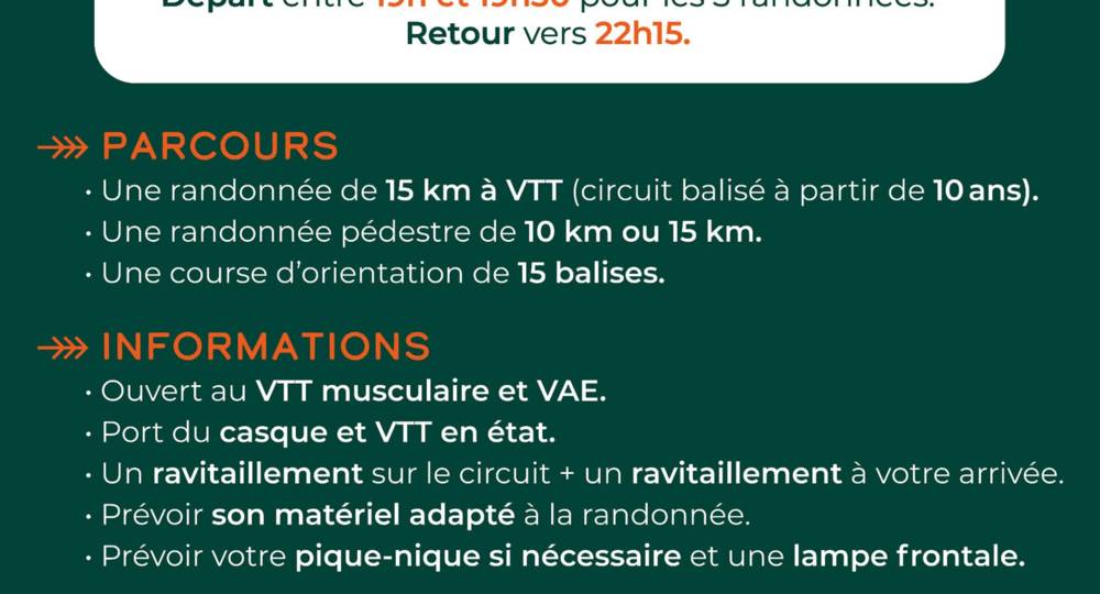 – 2 circuits à pied de 10 km et 15 km environ (départ 19h)