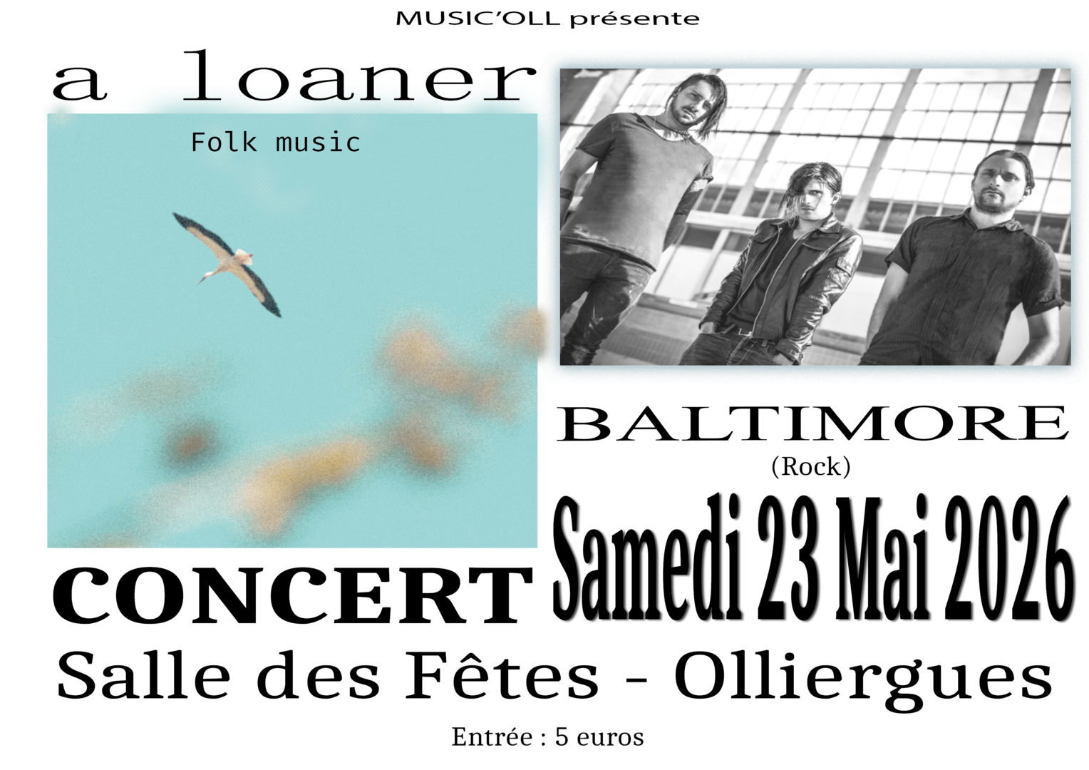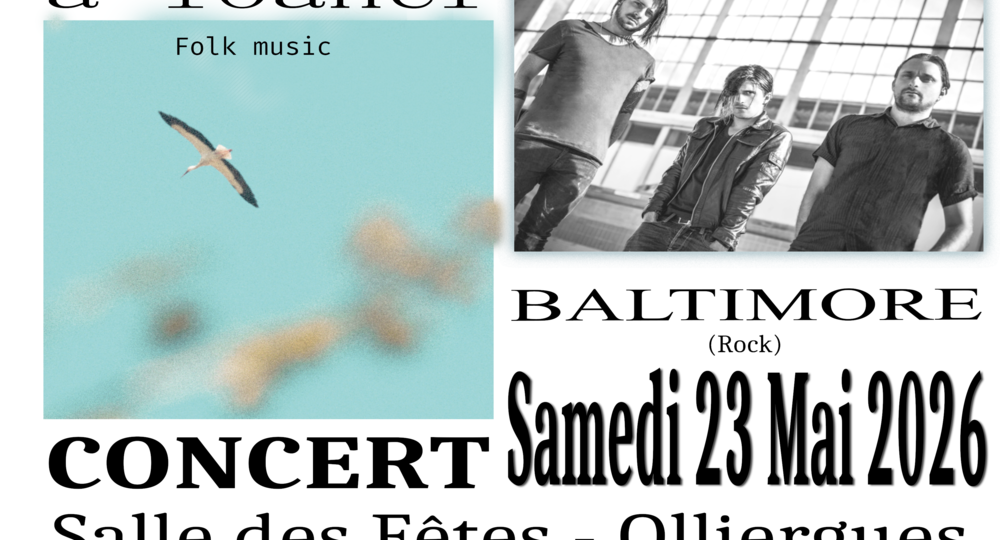 Concert : A Loaner (folk) et Baltimore (rock), organisé par l’association Music’Oll, le 23 mai à partir de 20 heures à la salle des fêtes d’Olliergues.