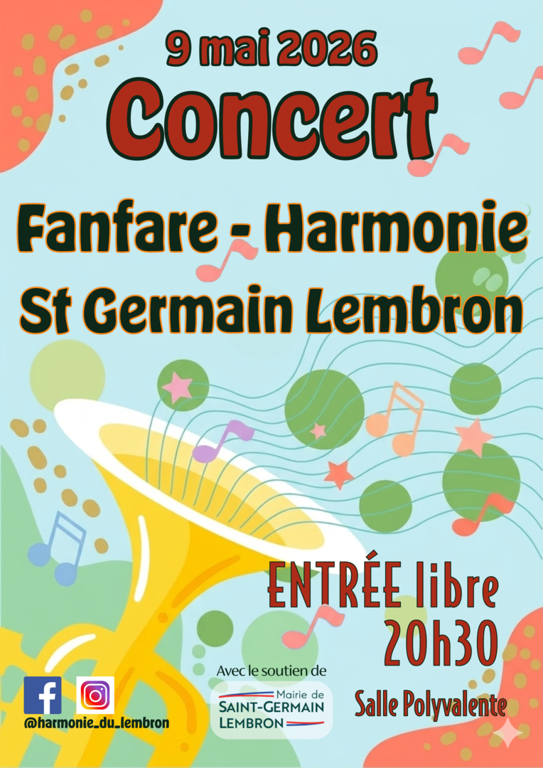 Concert de la Harmonie-Fanfare de Saint-Germain-Lembron. Un programme musical joyeux, aux couleurs du monde, pour voyager et passer un bon moment. Musique festive, pour fanfare et harmonie.