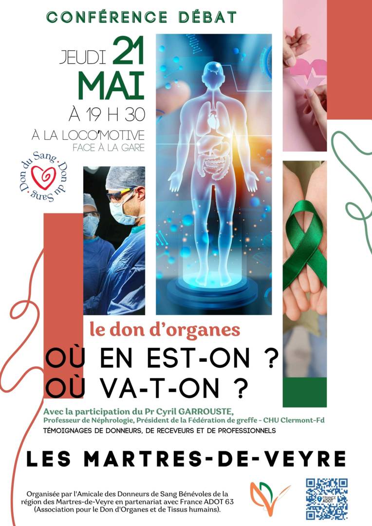 « Où en est-on ? Où va-t-on ? »Conférence débat organisée par l’association des donneurs de sang des Martres-de-Veyre et sa région, en collaboration avec l’ADOT63.