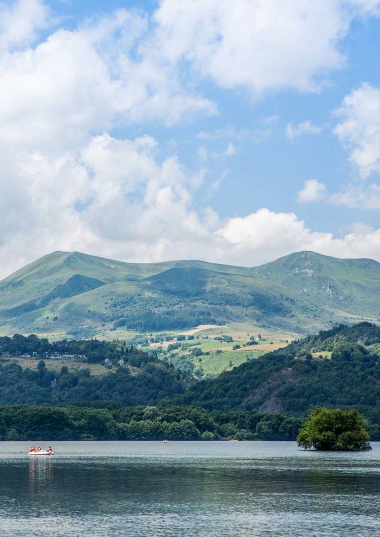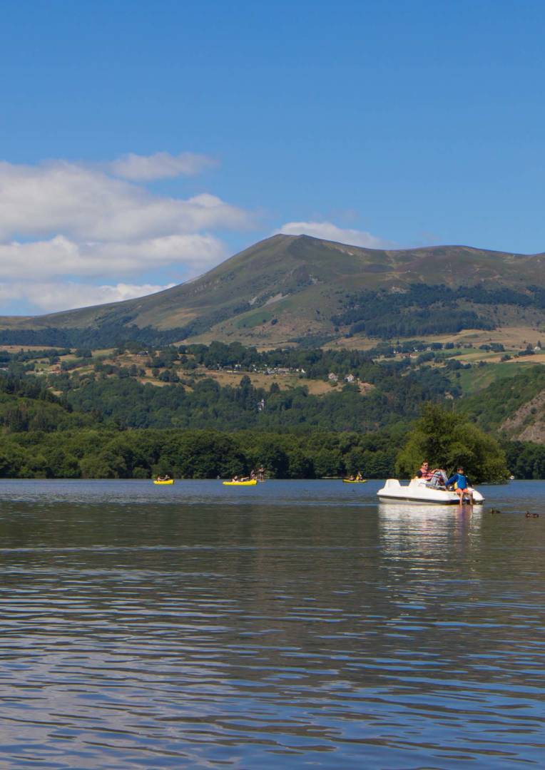 Arrêt à la Grande Plage du Lac Chambon : très beau panorama sur le lac avec le Sancy en toile de fond. Lac de barrage volcanique, peu profond, le lac Chambon est le lieu idéal pour la baignade.