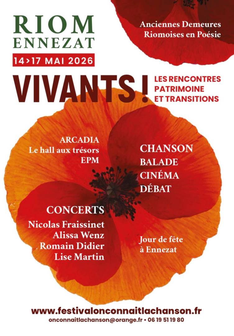– Des concerts de chanson française : avec Lise MARTIN jeudi 14 mai à 20 h 30 : 1 Rue de l’Intendance d’Auvergne à Riom ; puis, au cinéma Arcadia : Alissa WENZ à 17h30 et Romain DIDIER à 21h le vendredi 15 ; enfin Nicolas FRAISSINET samedi à 17h30.