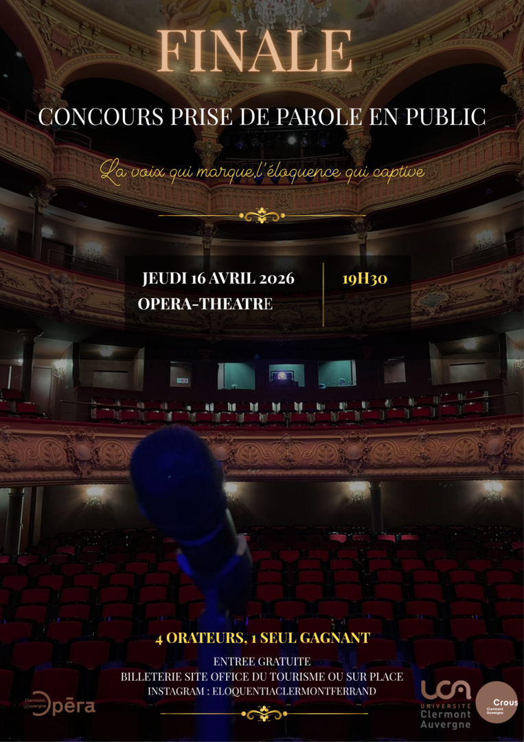 Organisée par Eloquentia Clermont-Ferrand, la finale du concours de prise de parole marque l’aboutissement de plusieurs semaines de sélection, d’apprentissage et de dépassement de soi. Après un parcours exigeant, ils ne sont plus que quatre finalistes en lice. Quatre personnalités, quatre styles, quatre voix qui se sont distinguées par leur capacité à convaincre, émouvoir et captiver un public. Le 16 avril, ces candidats monteront sur scène pour une ultime confrontation. La finale prendra la forme de duels oratoires : les finalistes s’affronteront deux à deux, chacun défendant un point de vue à travers un sujet imposé. Un exercice exigeant, où la force de l’argumentation, la maîtrise du discours et la présence scénique feront toute la différence. Face à eux, un jury attentif et un public engagé, prêts à se laisser surprendre par la puissance des mots et la richesse des idées. Au-delà de la compétition, cet événement célèbre l’éloquence comme un véritable outil d’expression et d’impact. Chaque prise de parole sera une invitation à réfléchir, ressentir et débattre. À l’issue de cette finale, un lauréat sera désigné pour représenter Clermont-Ferrand à Paris, où il portera haut les couleurs de la scène locale dans la suite de l’aventure Eloquentia.