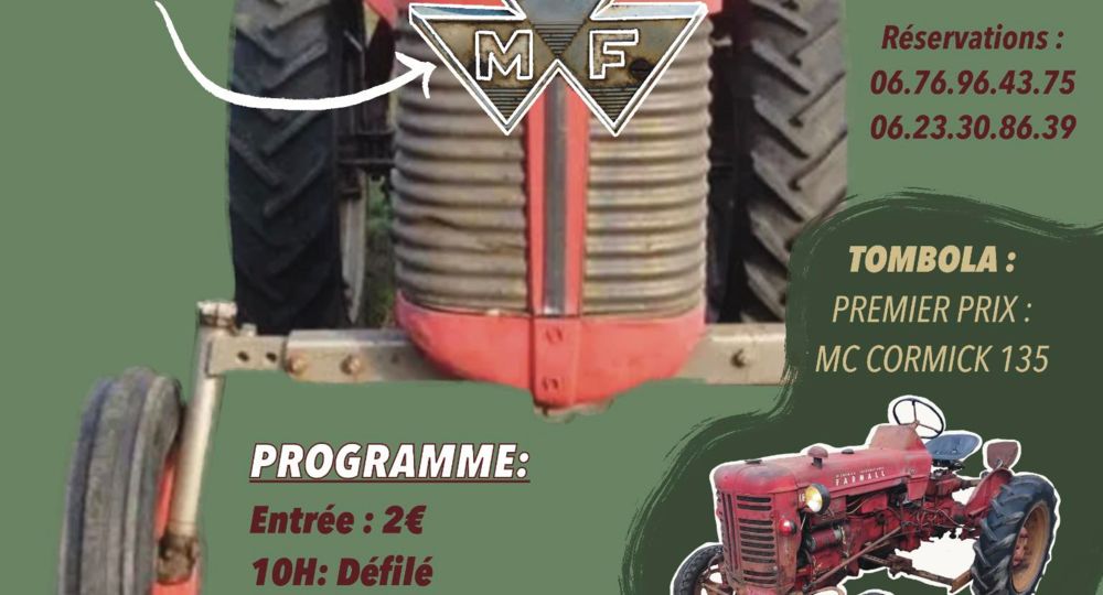 10h : défilé de tracteurs anciens. 12h repas à 20 euros (réservation obligatoire). 14h à 19h : Gymkhana, bourse aux pièces de vieux tracteurs et véhicules anciens. Tombola 1er prix 1 tracteur Mc Cormick.