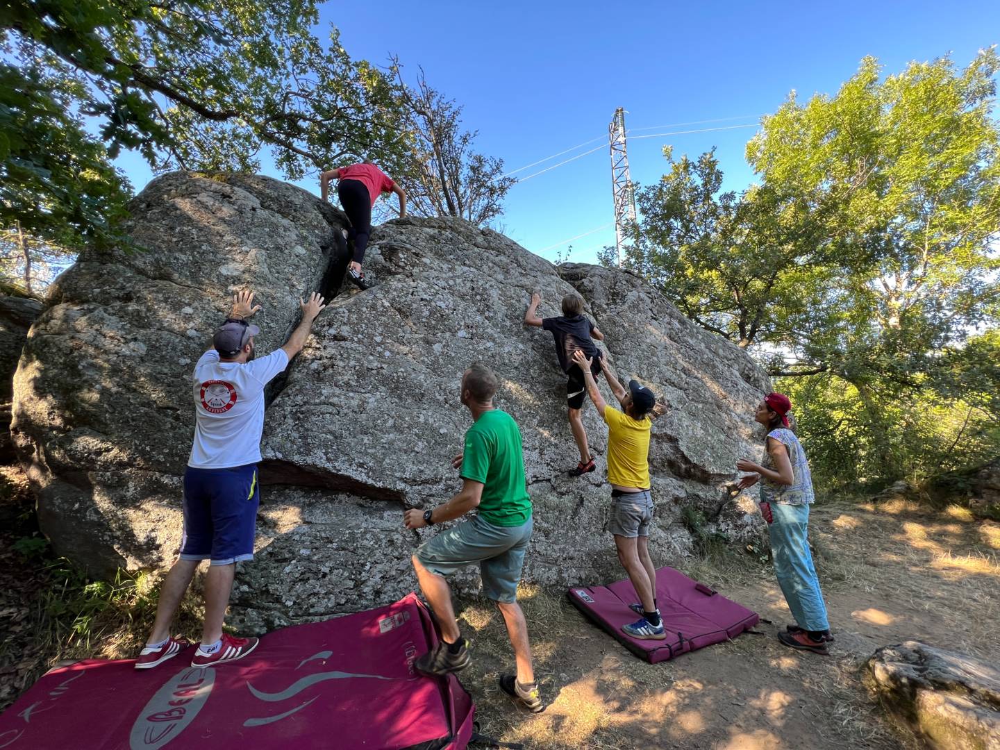L’escalade sur blocs se pratique sur de petits rochers mesurant entre 3 et 5 mètres, des matelas sont disposés au sol et un partenaire de grimpe est présent afin d’assurer une parade en cas de chute.