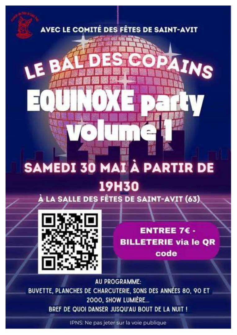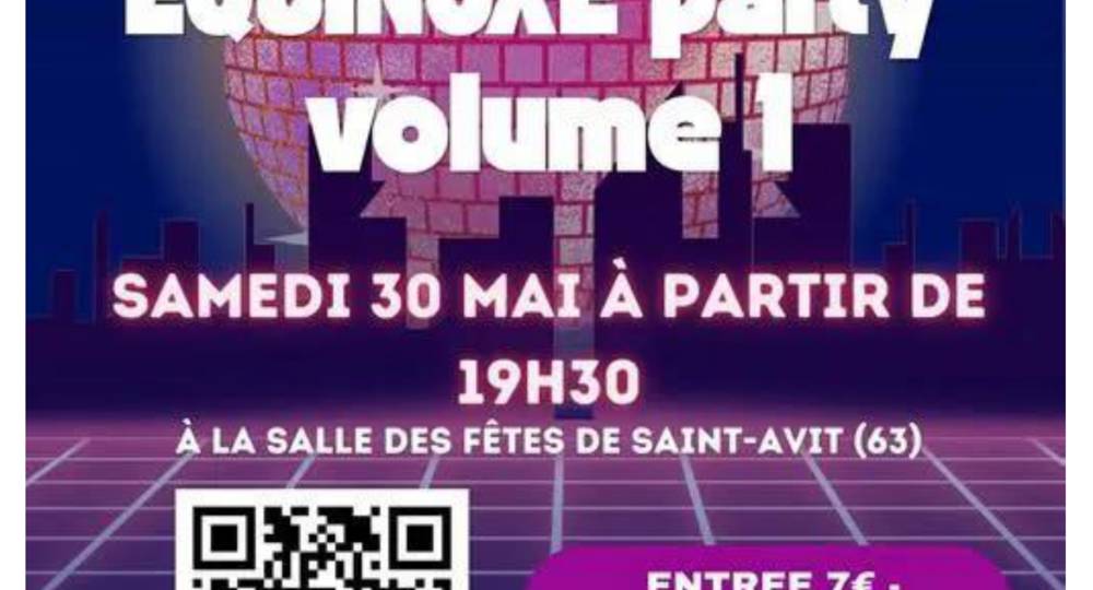 Equinoxe party volume 1. Buvette, planches de charcuterie, musique des années 80, 90 et 2000, show lumière… Venez danser jusqu’au bout de la nuit ! Un événement organisé par le comité des fêtes du village.