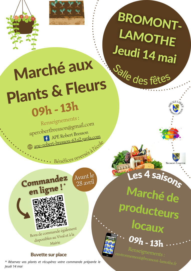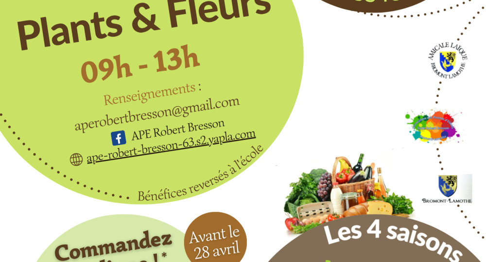 Réservez vos plants en ligne sur le site internet de l’APE (https://ape-robert-bresson-63.s2.yapla.com/) avant le 28 avril et récupérez votre commande directement le jour du marché.
