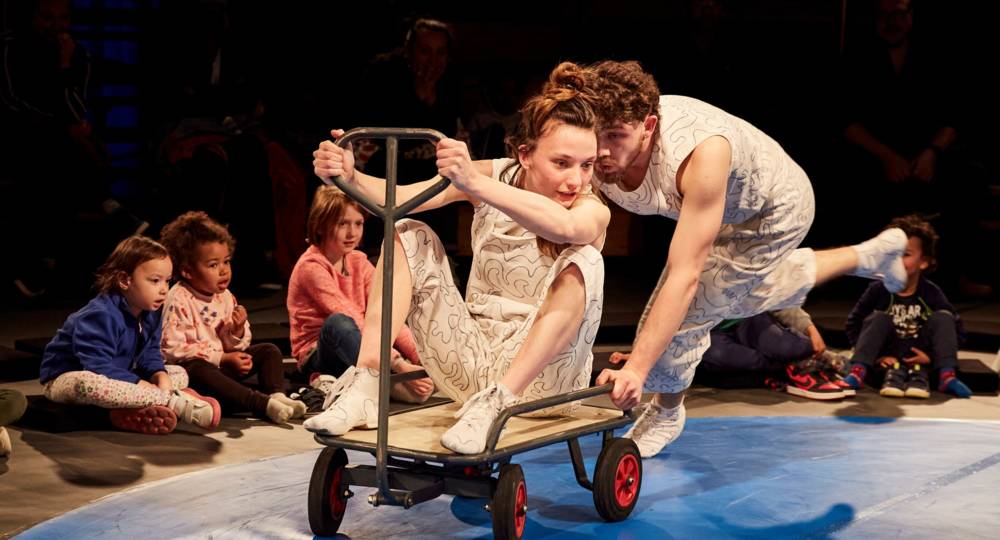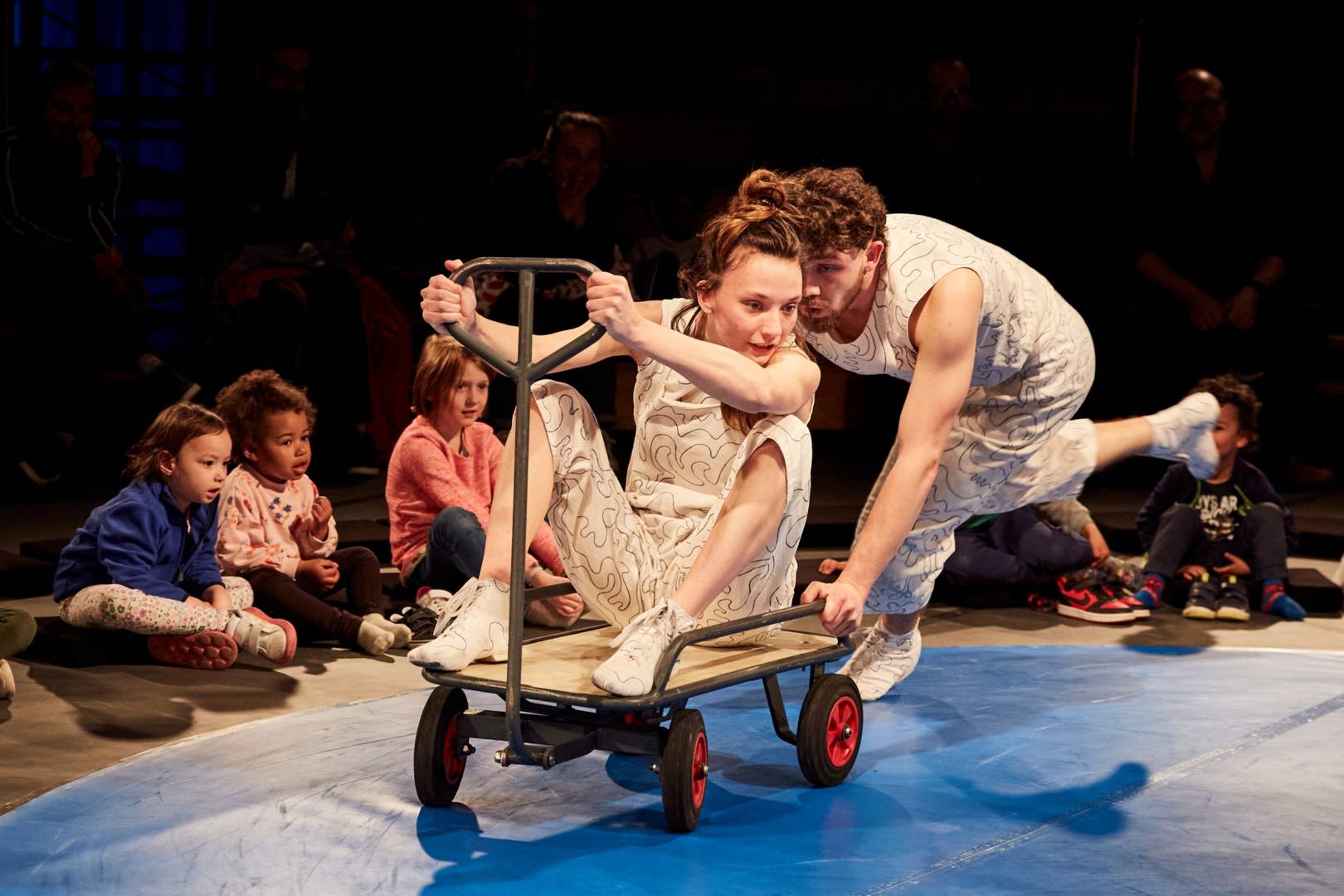 En guise de terrain de jeu : la piste. Comme jouets de départ, un Hula Hoop et un chariot à roulettes. Ces disciplines de cirque, entremêlant corps et objets, sont prétextes à d’instables situations où toujours demeure cette question fondamentale des portés acrobatiques : l’altérité. En gigotant, se poussant, ou se soutenant, il et elle découvrent comment « Je » et « Tu » peuvent se construire ensemble en se confrontant au monde et à l’autre.