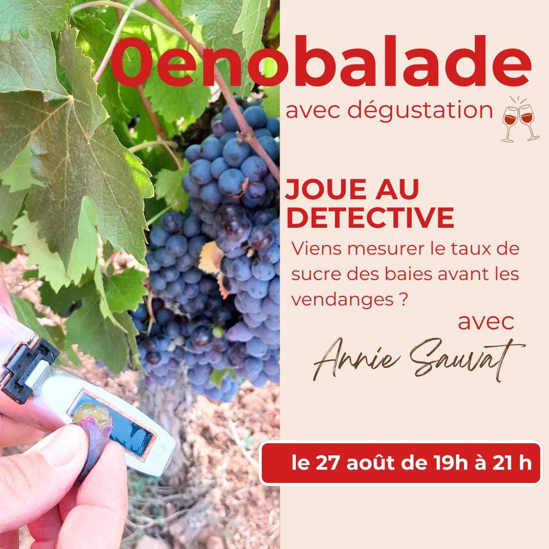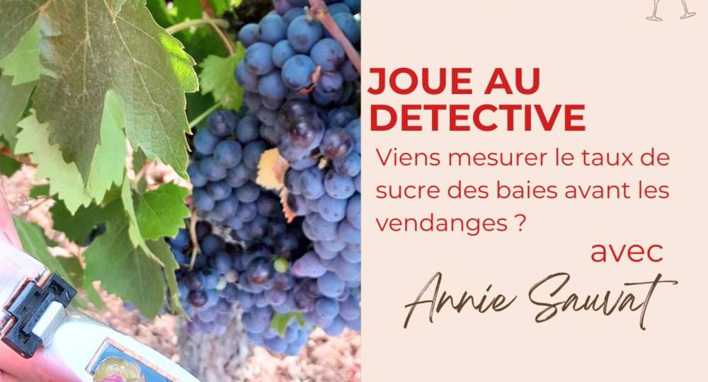 Lors de l’oenobalade du 20 août, Annie vous propose de jouer au détective du vignoble. En parcourant les vignes, vous apprendrez comment on suit l’évolution des grappes à l’approche des vendanges. Vous observerez la couleur des baies, leur texture, leur goût… puis vous utiliserez un réfractomètre pour mesurer vous‑même le taux de sucre, un indicateur essentiel pour choisir la date de récolte.