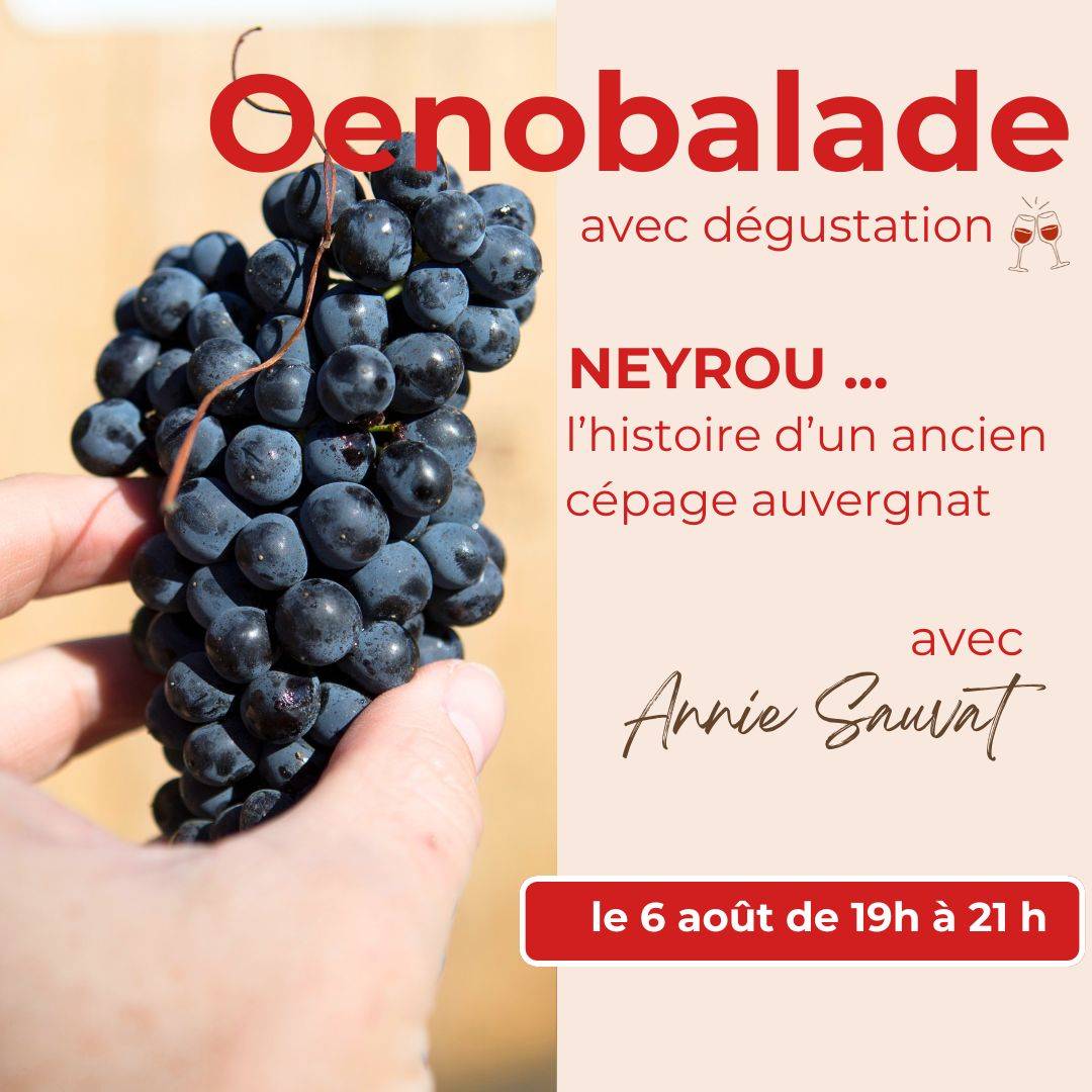 Lors de l’oenobalade du 6 août, Annie vous invite à découvrir le Neyrou, un ancien cépage auvergnat longtemps tombé dans l’oubli. En marchant dans le vignoble, vous apprendrez comment ce raisin rare a traversé les siècles, pourquoi il avait disparu et comment quelques vignerons passionnés travaillent depuis quelques années à le faire revivre.