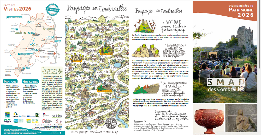 14h00 : lectures de paysages par Renée Couppat. Une curiosité géologique, le « château Banu » et le filon de quartz. Gemmes de Combrailles et diamants de Roche-d’Agoux. Vestiges des châteaux « Banu » et « Rapida » ; présentation des installations artistiques « Émergence » par la photographe Marielsa Niels et le Collectif « Les Vivaces » en partenariat avec les habitants de Roche D’Agoux.