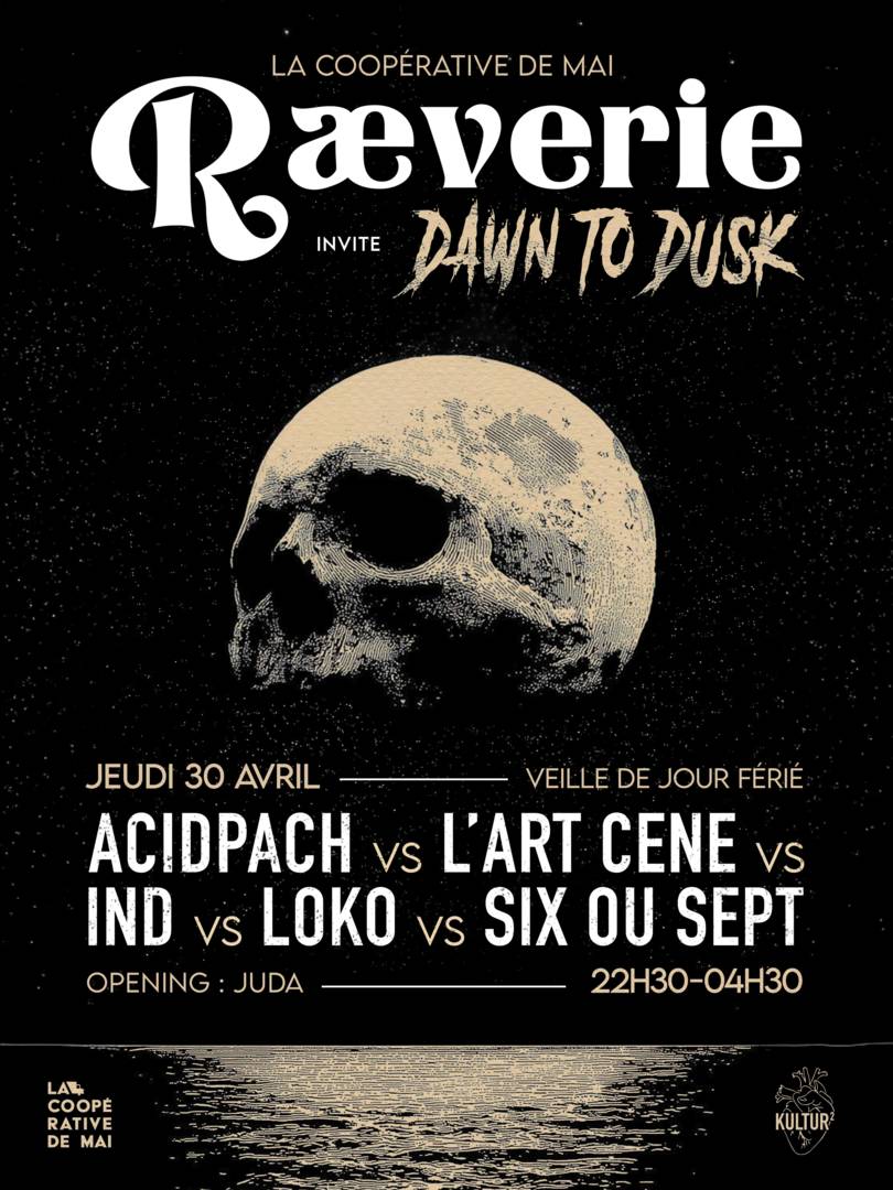Pour cette édition, l’association vous donne rendez-vous dans la fosse de la grande salle, dans un espace artistique central inédit, surplombé d’une scénographie réalisée par 512 Factory. Au programme de cette nuit d’anthologie, Acidpach, IND, L’Art Cène, Loko et Six ou Sept, un projet brut mêlant des versus entre ces artistes pour finir sur un live à 5. L’opening sera confié à JUDA, membre du collectif clermontois TechnoDome.