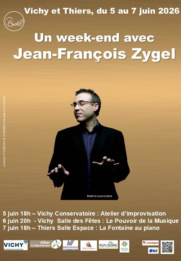 Samedi 6 juin à 20h, Vichy : Le Pouvoir de la Musique : Le célèbre pianiste compositeur Jean-François Zygel propose un voyage sonore captivant au cœur des émotions suscitées par la musique : quelle musique pour rêver, pour s’amuser, pour réfléchir, pour se consoler, pour s’élever ? Le virtuose imaginera en direct les réponses musicales à ces différentes questions, proposant une réflexion partagée avec les spectateurs de ce récital aussi singulier que personnel.