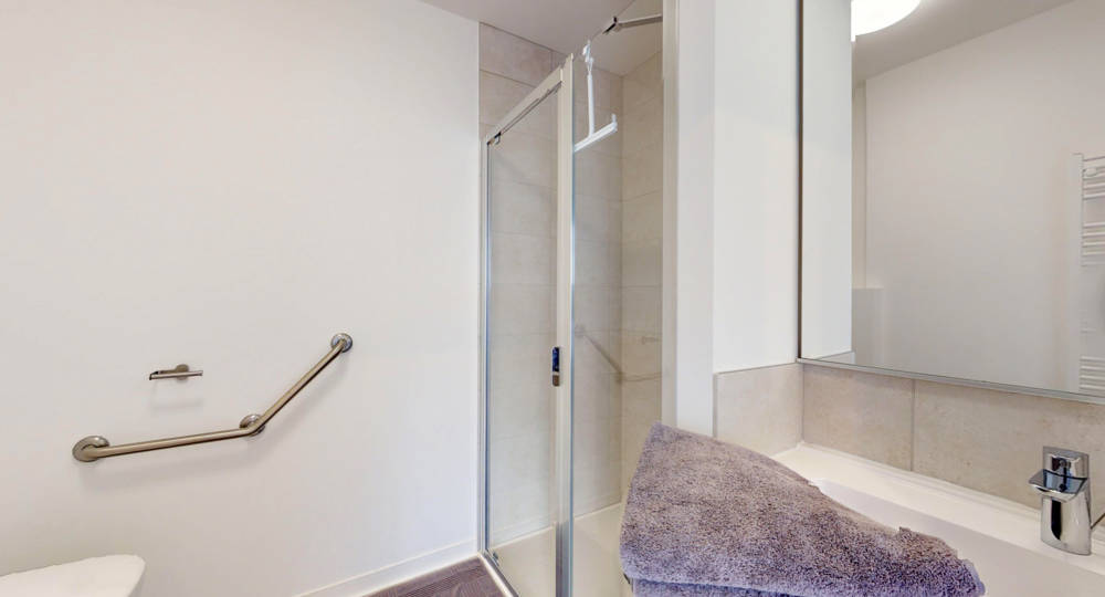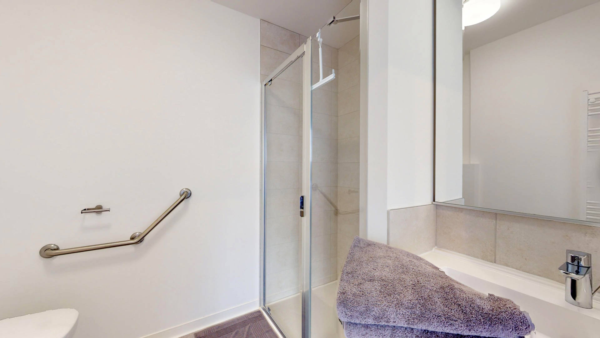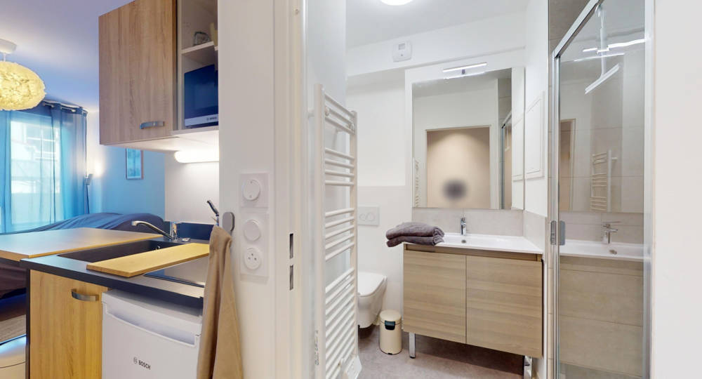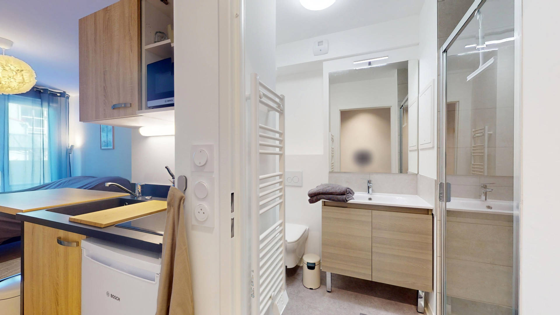 Salle d’eau (meuble vasque, douche, WC, sèche-serviette, linge de toilette fourni),
