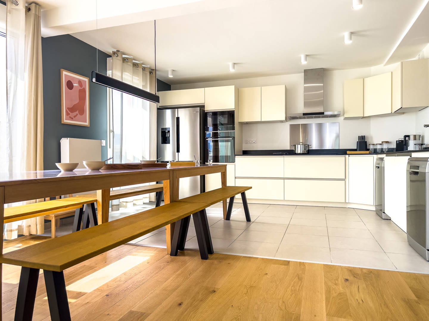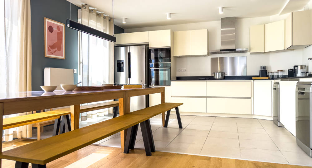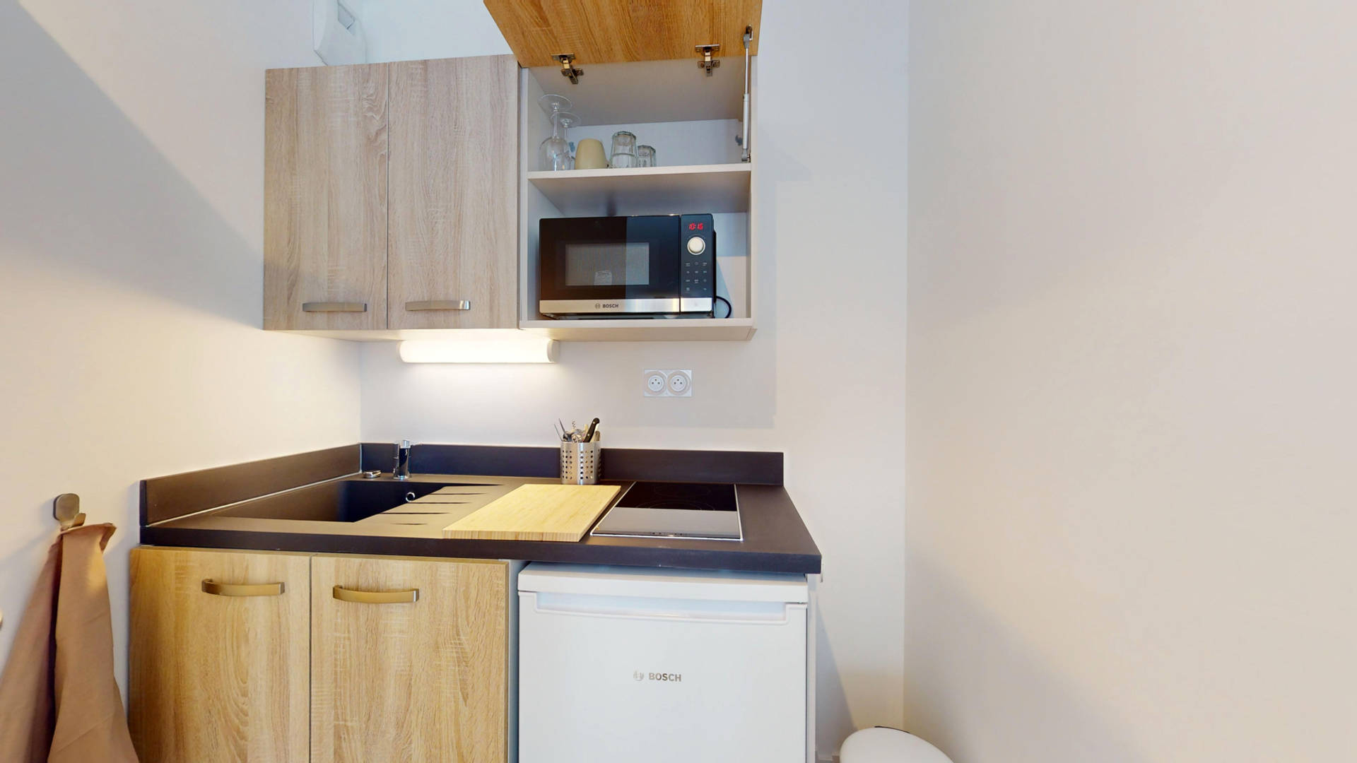 Kitchenette avec vaisselle, micro-ondes, réfrigérateur, plaque vitrocéramique,