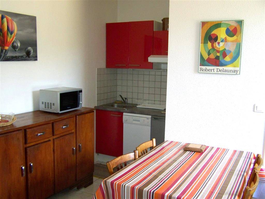 Cuisine-coin cuisine, lave-vaisselle, réfrigérateur, plaques électriques, hotte aspirante, micro-ondes multifonctions.