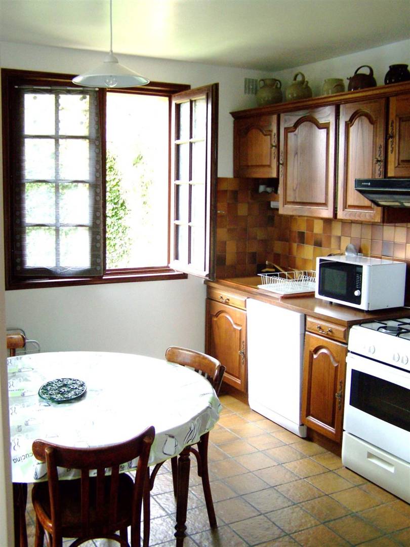 Cuisine équipée, lave-vaisselle, réfrigérateur-congélateur, gazinière 4 feux et four, hotte aspirante, micro-ondes.