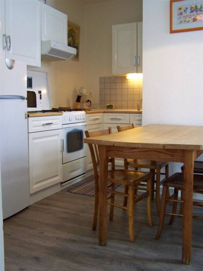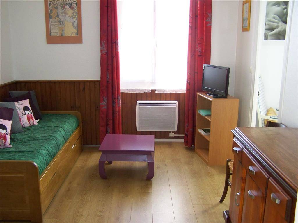 Cuisine équipée, gazinière 4 feux et four, hotte aspirante, réfrigérateur-congélateur, micro-ondes, aspirateur, fer et planche à repasser, lit et chaise bébé, séjour avec 1 divan, télévision TNT, une chambre avec 1 lit double, une salle de bain et WC privés, chauffage électrique, lave-linge collectif, entrée indépendante, petit balcon, terrasse, salon(…)