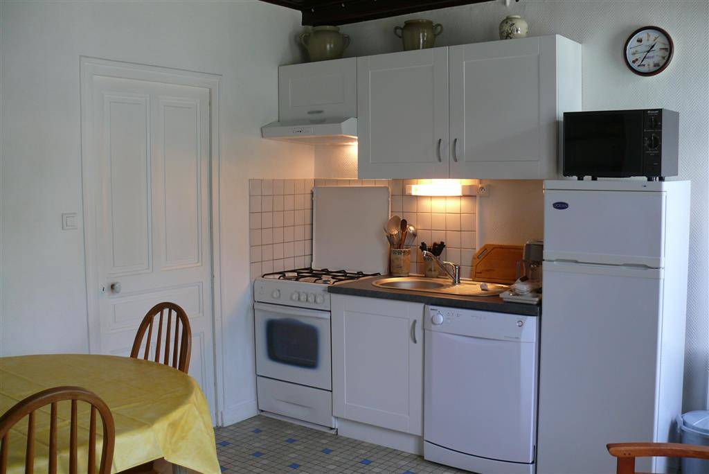 Cuisine-coin cuisine, lave-vaisselle, réfrigérateur-congélateur, gazinière 4 feux et four, hotte aspirante, micro-ondes, coin salon, télévision TNT.