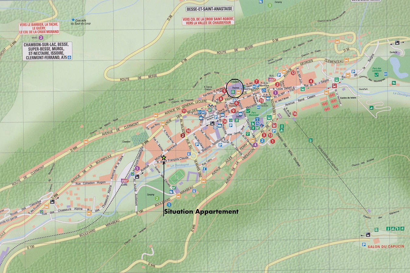 Appartement tout proche de l’ancienne gare SNCF et de l’arrêt navette pour le Sancy et le Capucin (circule en hiver les week-ends et vacances scolaires). L’arrêt pour la navette thermale se situe à 250m.