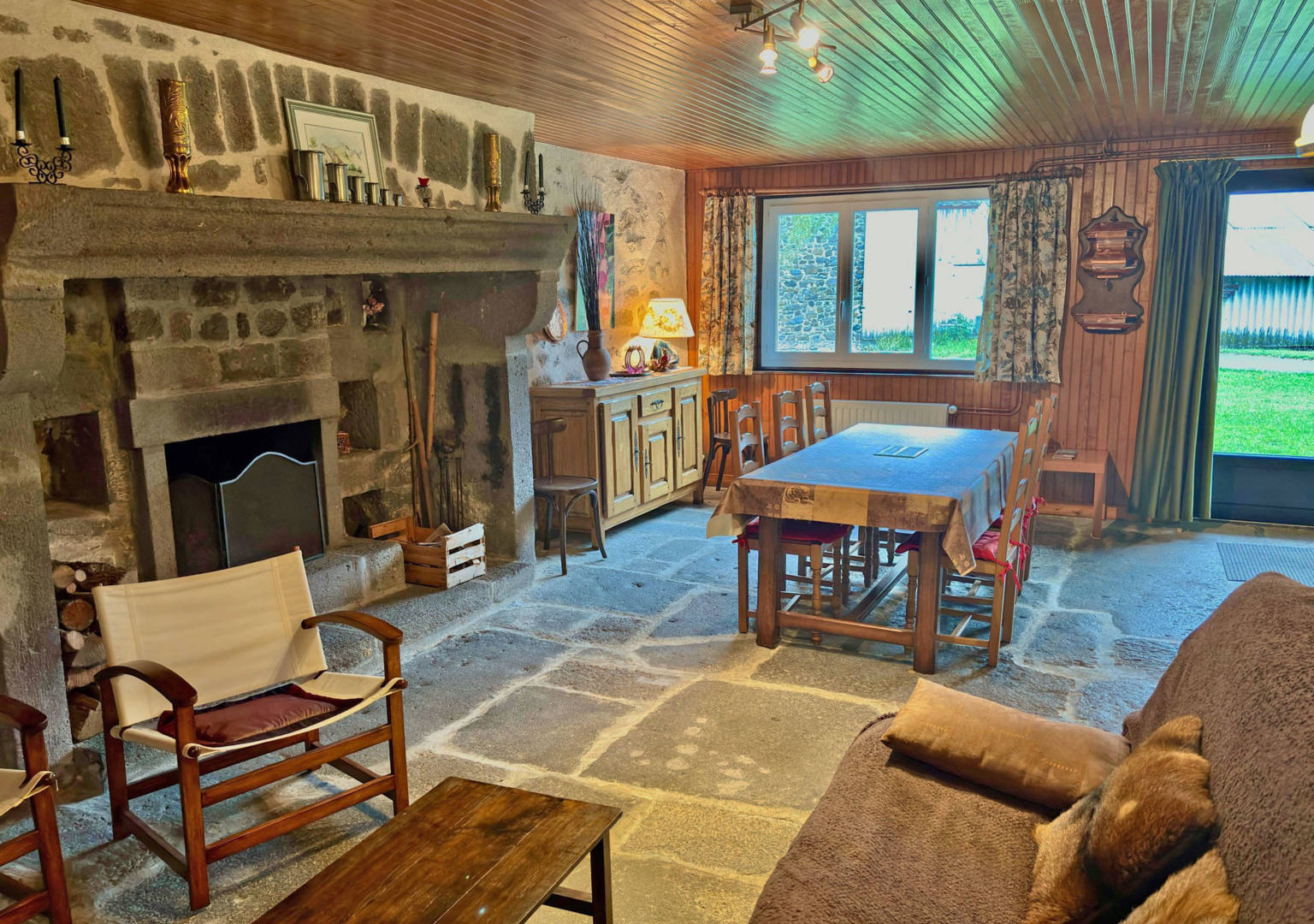 Grande salle de séjour avec cheminée, coin salon et canapé convertible.