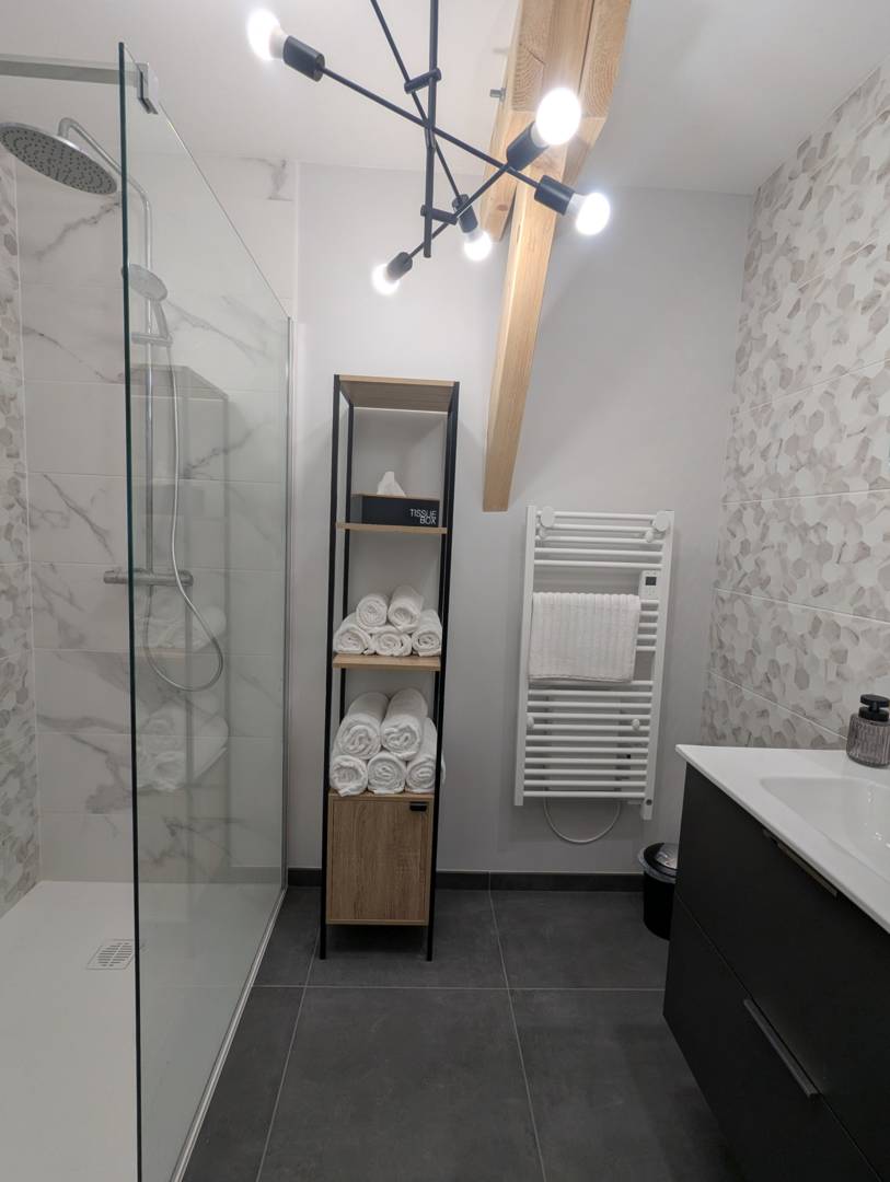 Appartement entièrement créé composé de 2 chambres (1 chambre avec un lit king size 180×200 et 1 chambre avec un lit king size 180×200 + 1 lit cabane 90×200), literie française neuve, une salle de bain avec douche à l’italienne, WC séparé, une buanderie toute équipée (lave linge et sèche(…)