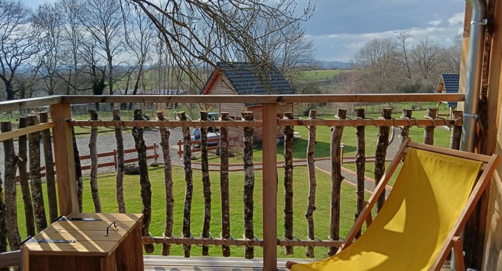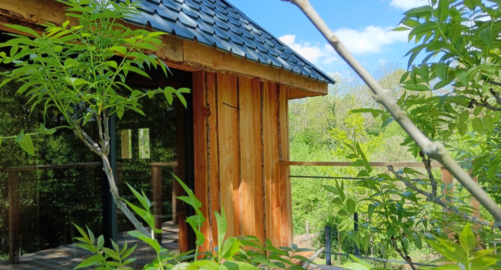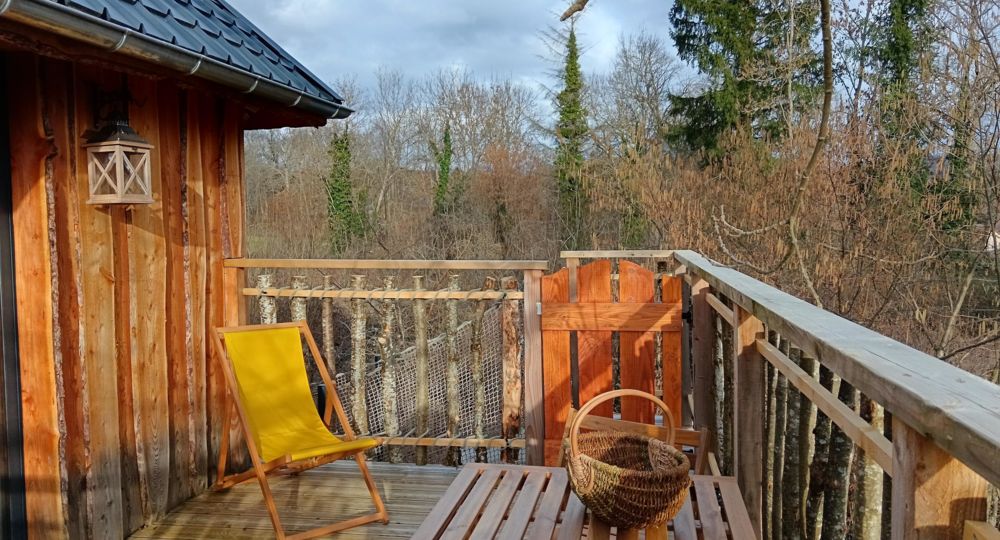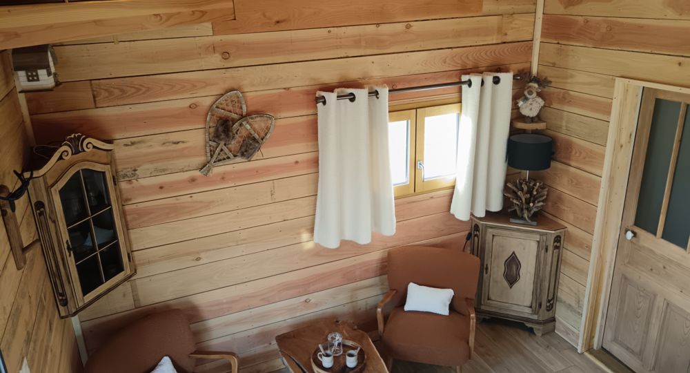 Notre cocon insolite sur pilotis, accessible par un escalier, est installé entre des arbres. Ici vous dormirez bercés par les sons de la nature. L’intérieur chaleureux dispose de tout le confort nécessaire (électricité, chauffage, wifi), il est entièrement décoré sur le thème de la montagne. Il est composé d’une chambre avec un grand lit, un coin cosy avec deux fauteuils et d’une table basse en bois permettant de profiter d’un bon livre et d’un café; un petit coin équipé d’un petit frigo, un micro-ondes, une machine à café, une bouilloire; un espace sanitaires séparé avec toilettes sèches et lavabo. Des serviettes de bain sont à votre disposition et le lit est fait à votre arrivée. Ce petit nid douillet s’ouvre sur une terrasse ombragée qui vous invite à la détente : deux transats, une table et deux chaises vous attendent pour profiter du cadre calme et bucolique.