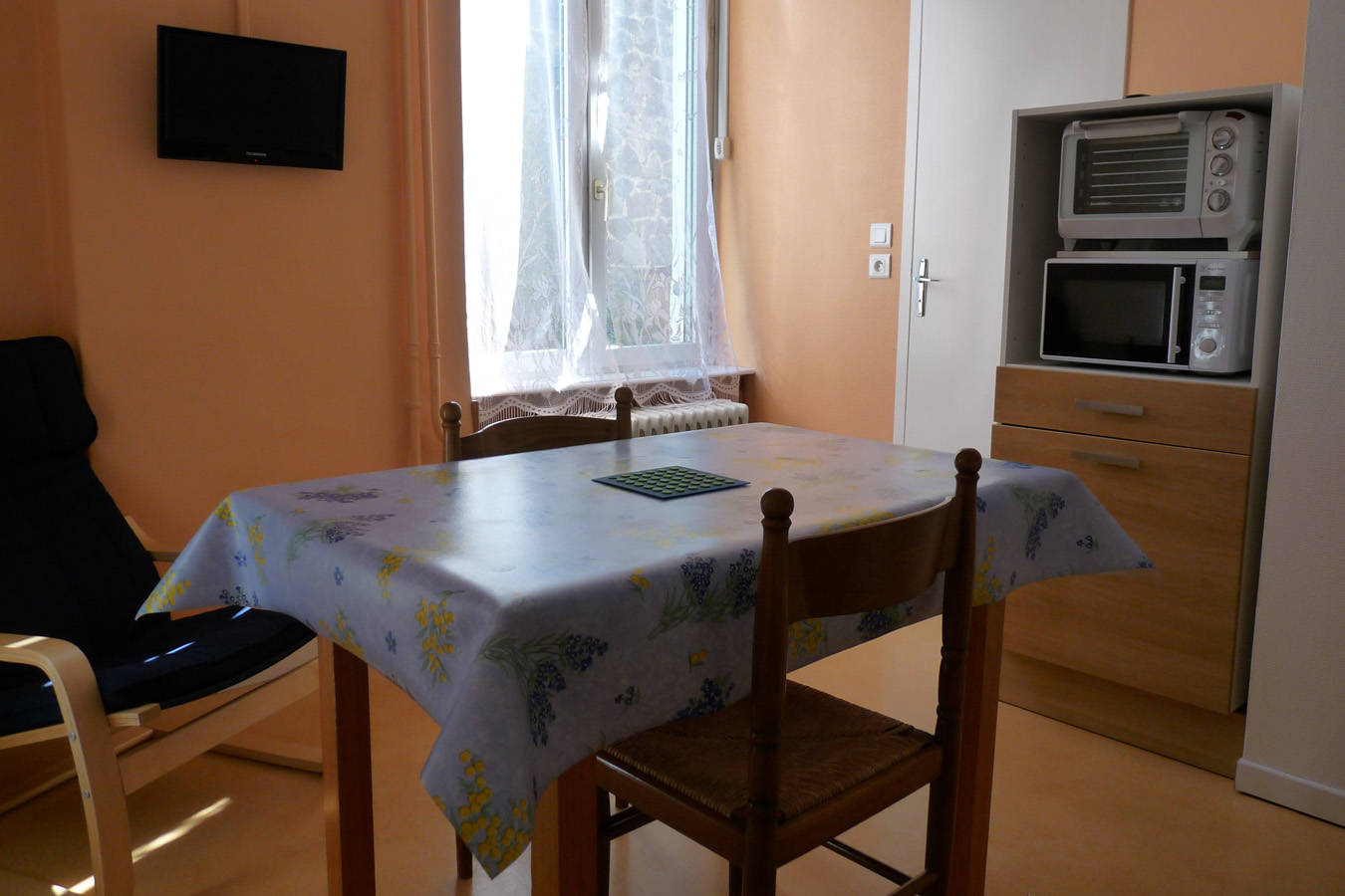 Situé au rez-de-chaussée de notre résidence, avec exposition sud et fenêtre sur cour privée. Il est constitué : – D’une pièce de vie avec cuisine aménagée, frigidaire avec compartiment congélateur, four, micro-ondes, deux plaques vitrocéramiques, bouilloire, cafetière, grille pain. – D’une chambre avec lit double en 140 X 190, armoire de rangement, deux tables de nuit, couverture, couette, deux oreillers et un traversin. – D’une salle de bain avec baignoire, lavabo, WC, radiateur soufflant. Wifi, télévision avec lecteur DVD intégré.