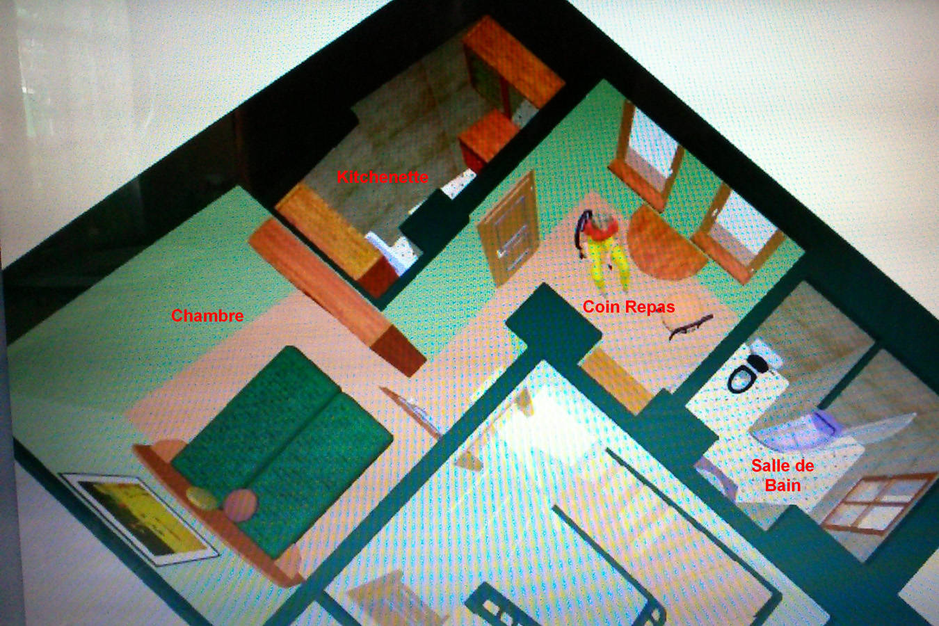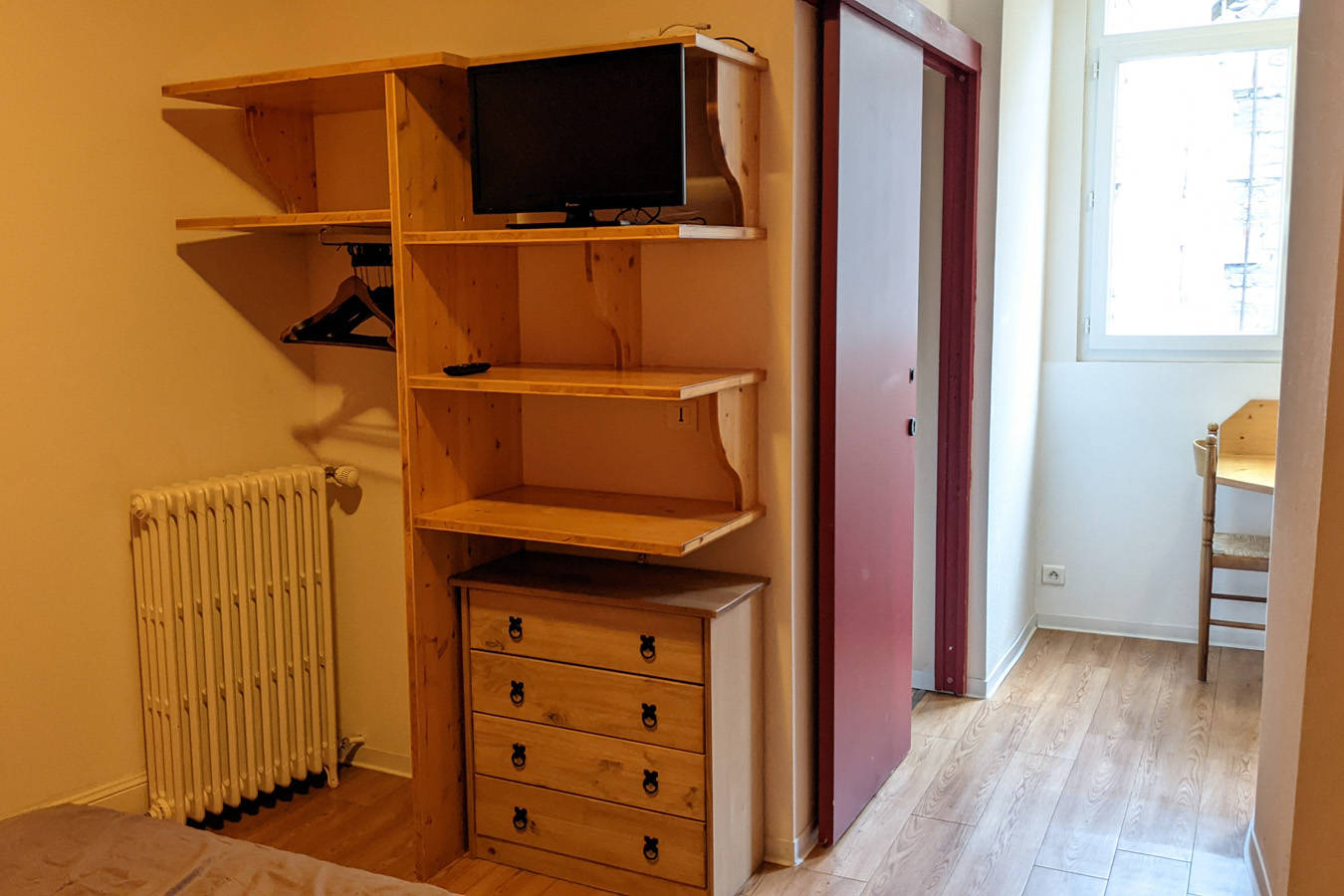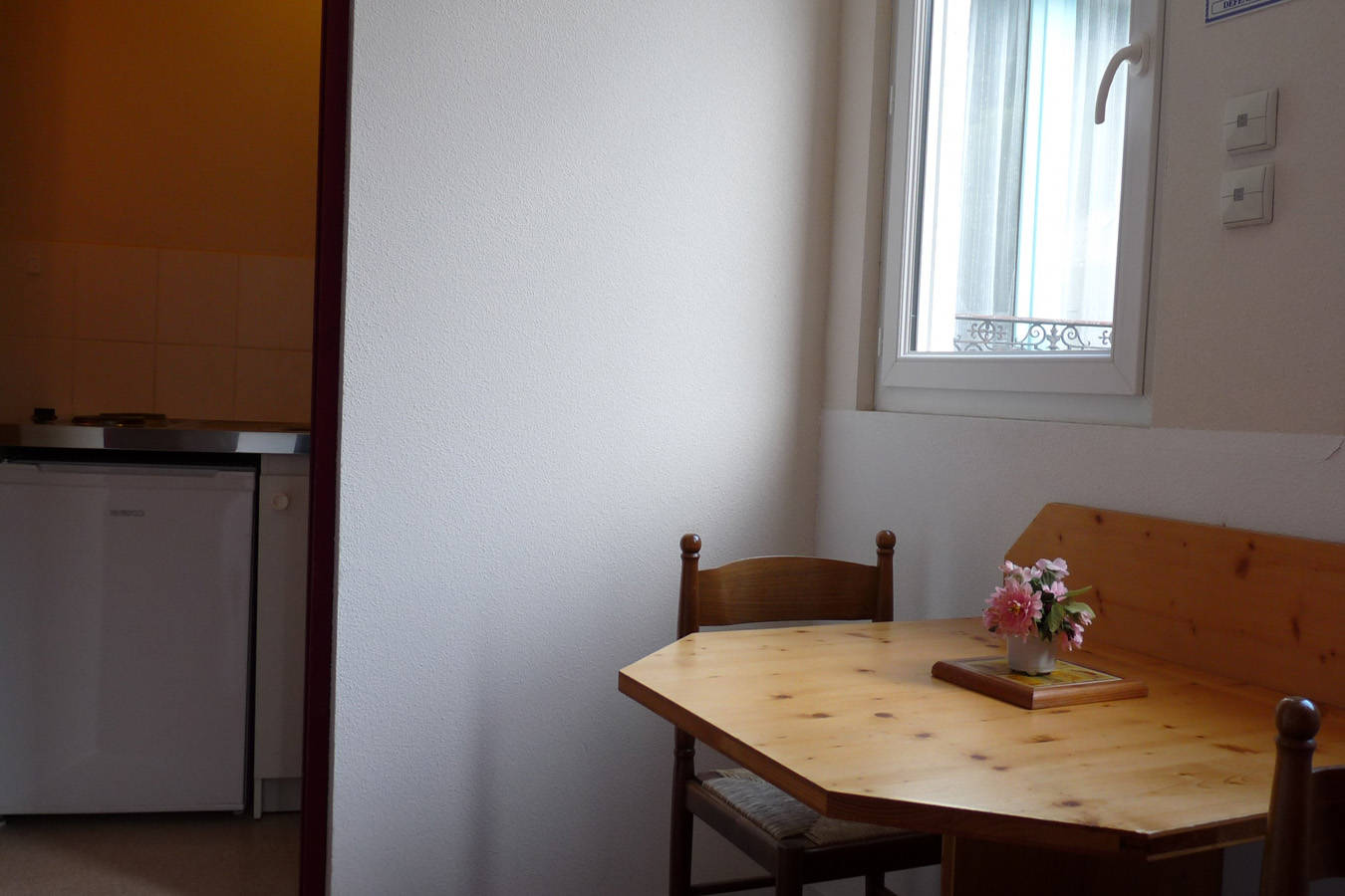 Studio pouvant recevoir 2 personnes. Situé au 1er étage de notre résidence avec exposition Sud et fenêtre sur cour privée. Il est constitué d’un coin chambre avec lit double et d’un espace repas séparé de la chambre mais ouvert sur celle-ci. La kitchenette est indépendante et dispose d’un frigo, 2 plaques électriques, four, micro-ondes, cafetière, bouilloire, grille-pain et vaisselle. Salle de bain avec douche, sèche-serviettes électrique. Wi-Fi, télévision.