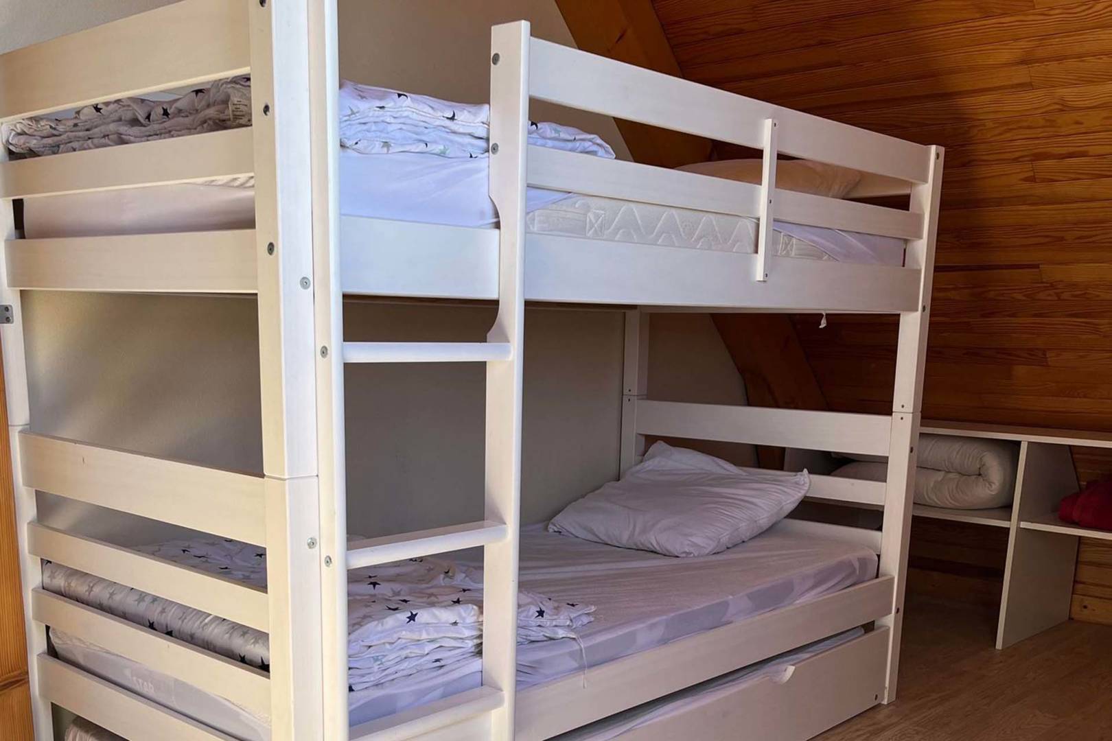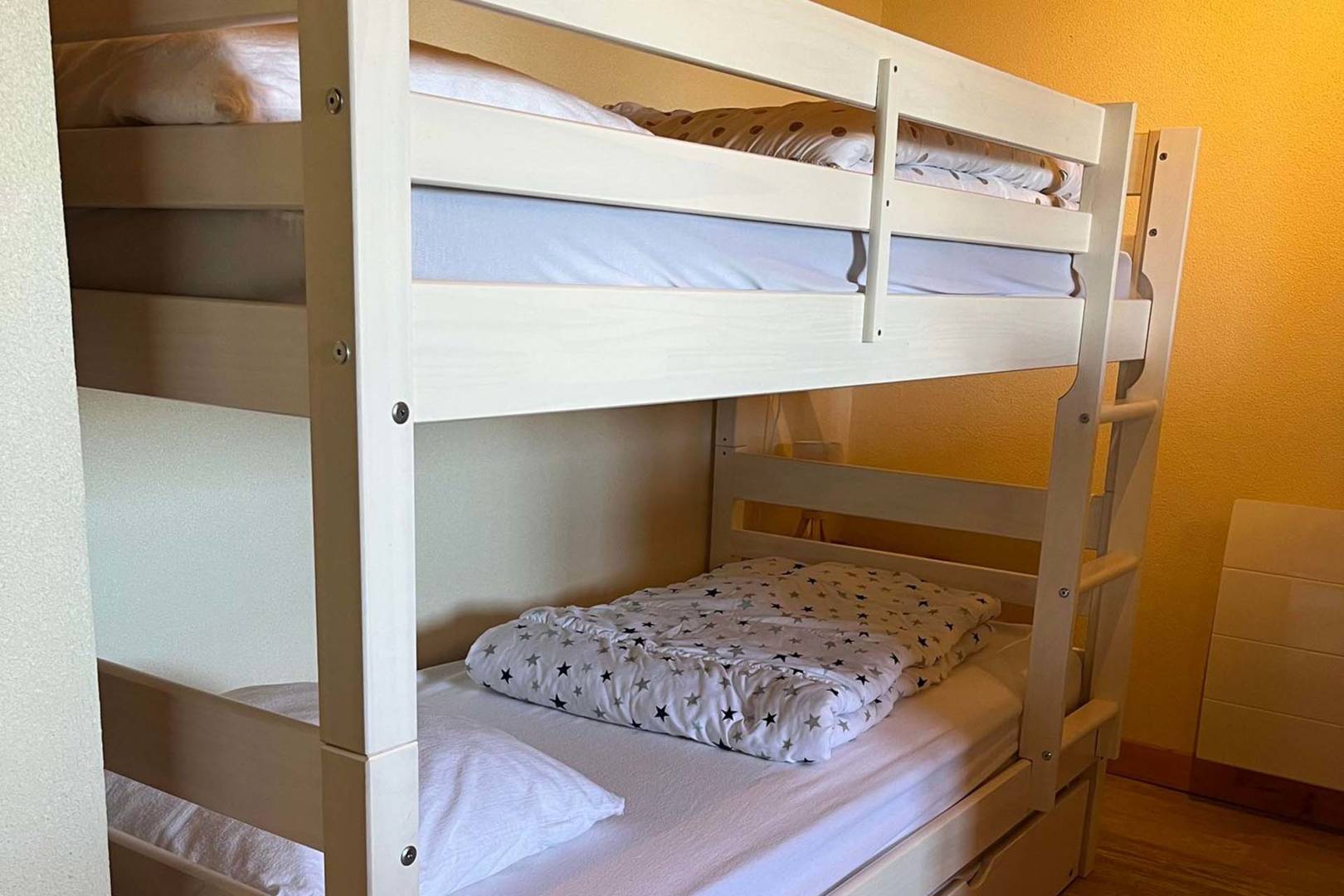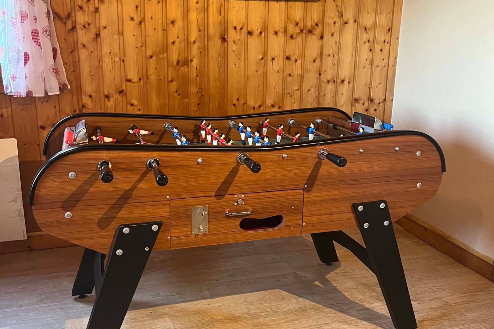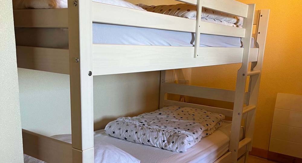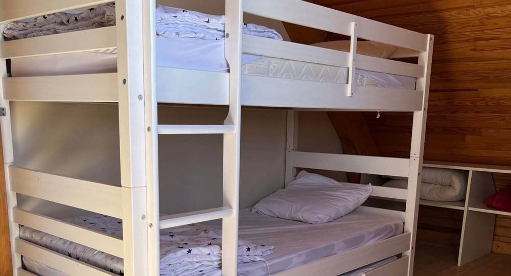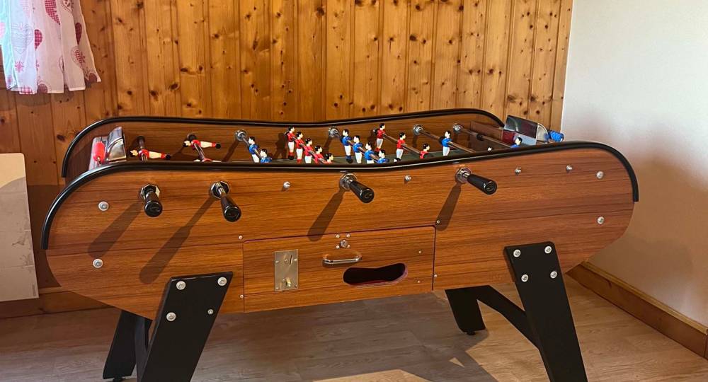 Une chambre avec un lit double, un lit superposé avec tiroir lit, un baby-foot