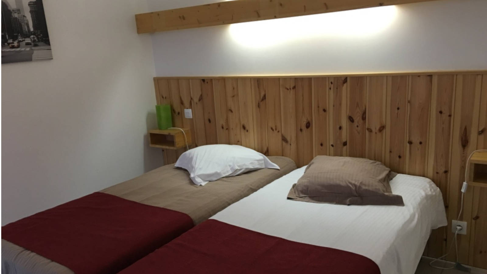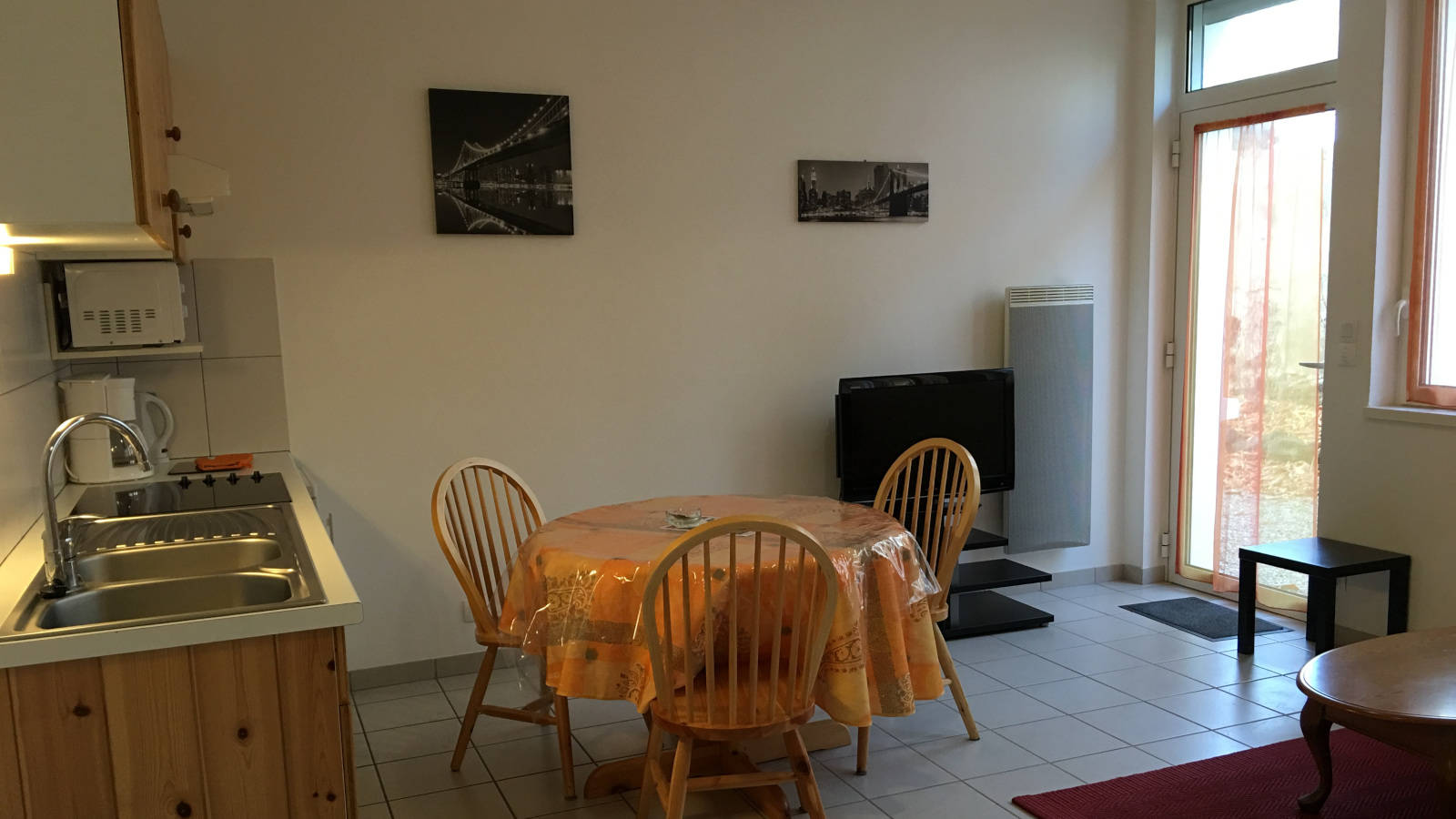 L’appartement n°2 est particulièrement calme, confort 3 étoiles. C’est un bel appartement meublé F2 de 40 m² situé au rez-de chaussée. Une grande chambre avec deux lits jumeaux de 90 cm, un salon, TV, canapé avec cuisine américaine et une vue très ensoleillée donnant sur la terrasse de plain-pied. Son état est neuf, bien équipé, il comprend tout le confort nécessaire à un séjour thermal, de tourisme en Auvergne ou pour le travail.