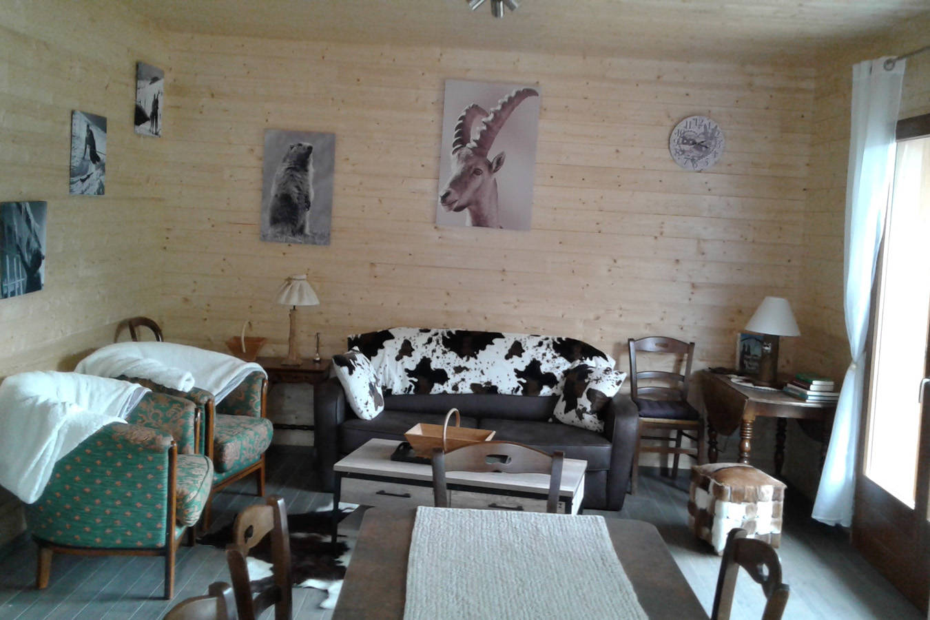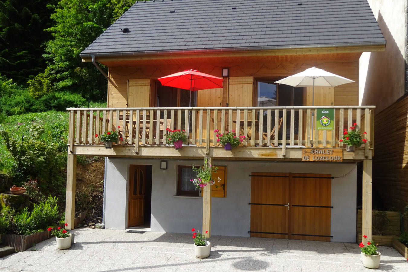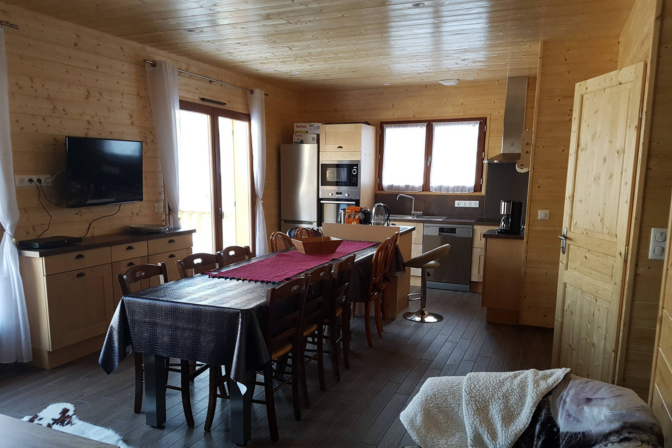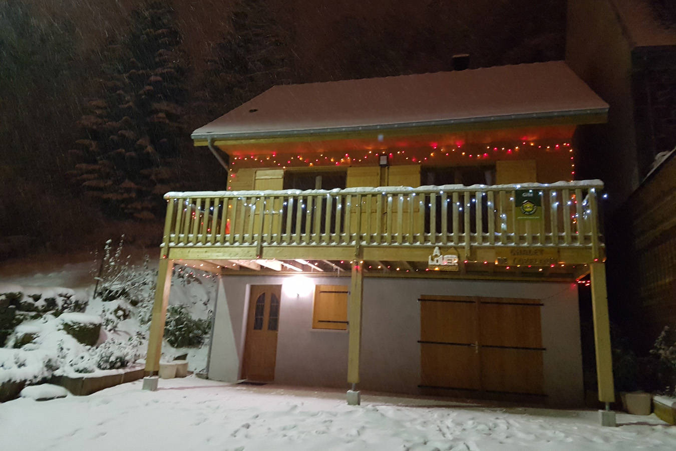 Le chalet comprend une terrasse, un balcon, une pièce de vie avec une cuisine ouverte, quatre chambres, deux salles d’eau avec une douche, deux WC, un garage, deux places de parking et un petit jardin.