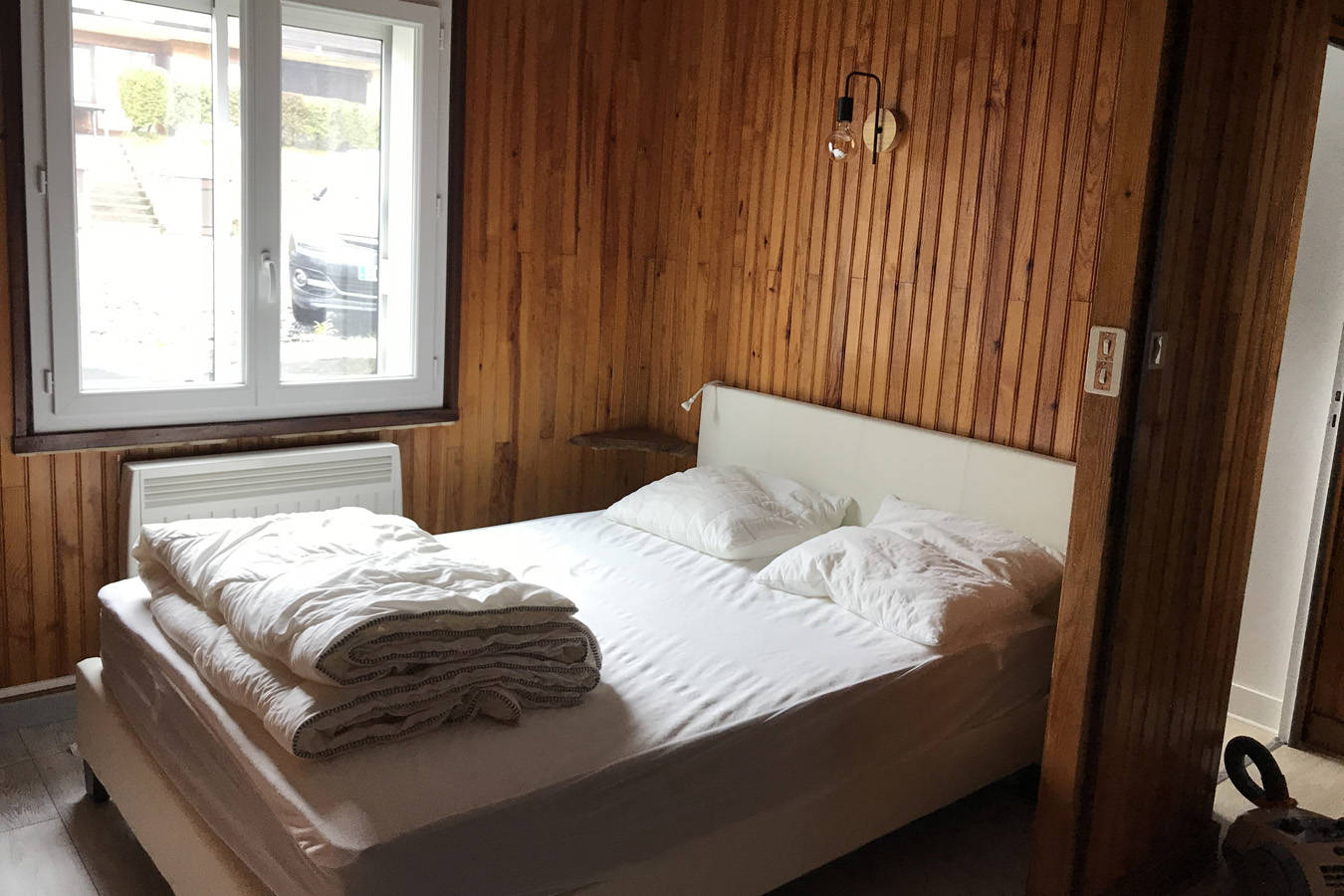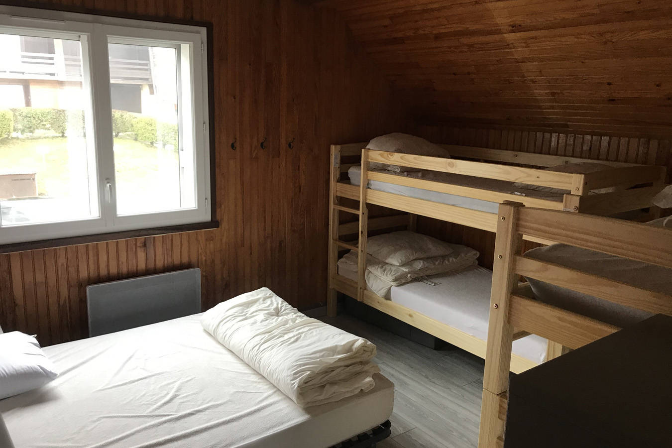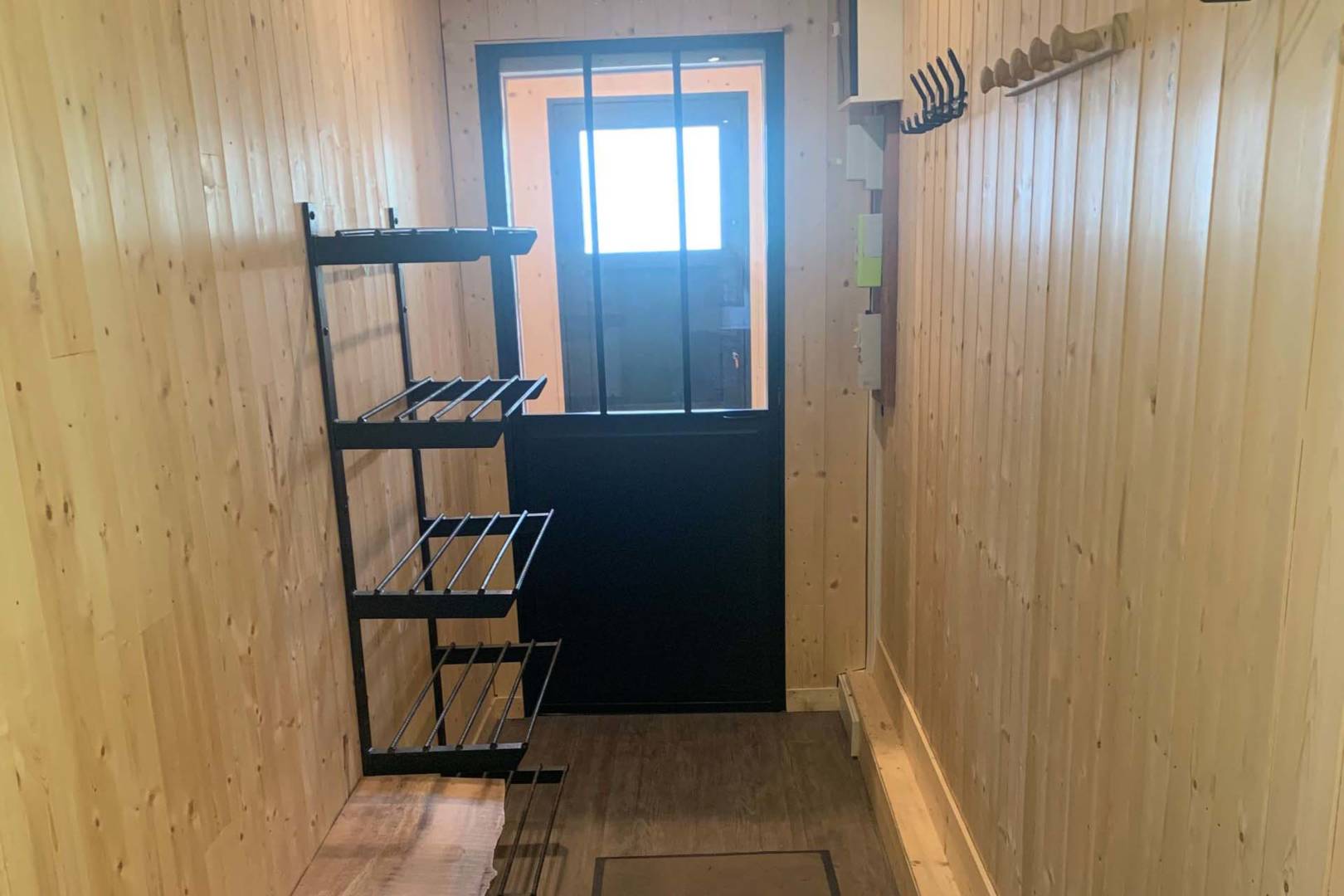Ce chalet dispose d’un rez-de-chaussée aménagé d’un râtelier à skis à l’entrée avec un couloir équipé de portes manteaux, une cuisine ouverte sur la pièce de vie, une chambre avec lit 140, une salle d’eau, toilette (séparées) et un cellier.