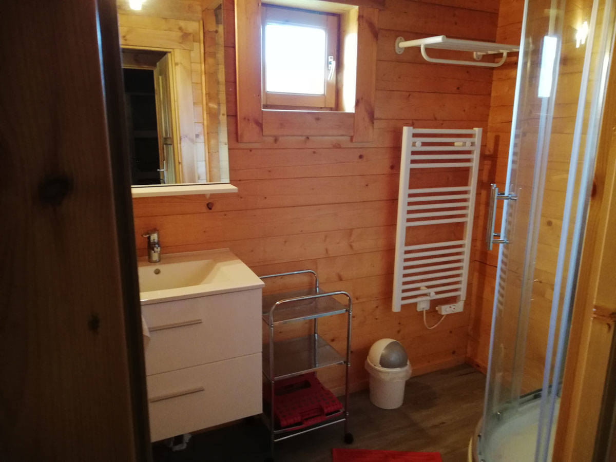 Au rez de chaussée : séjour de 30 m² sur cuisine ouverte, salle d’eau, WC séparé, cellier servant de local à skis, terrasse avec mobilier de jardin.