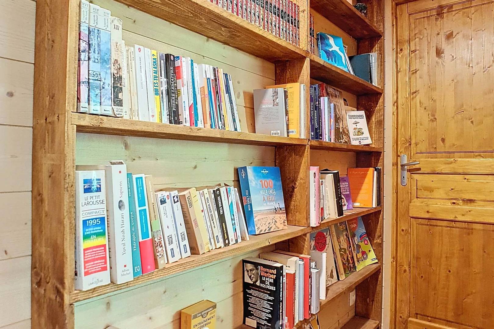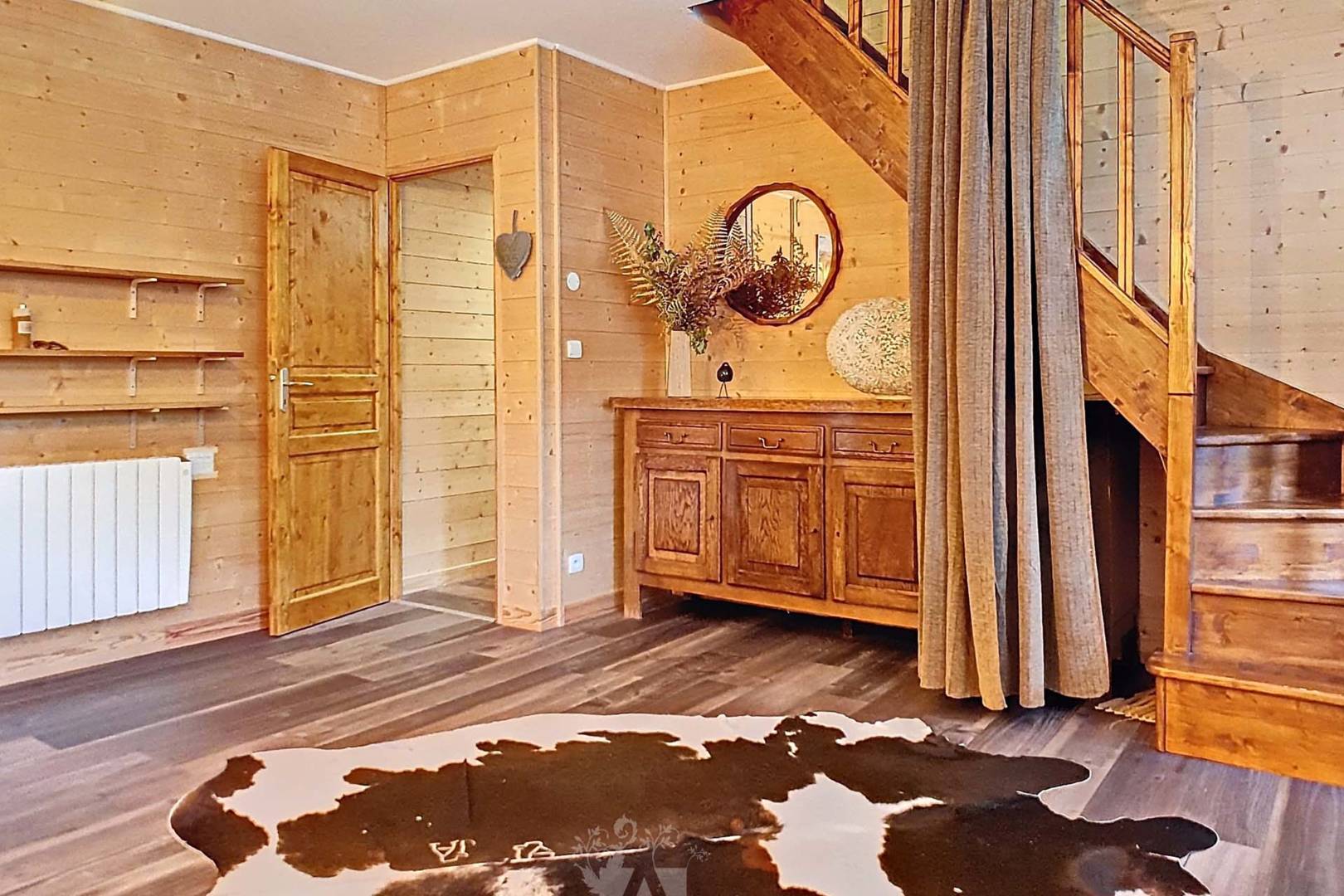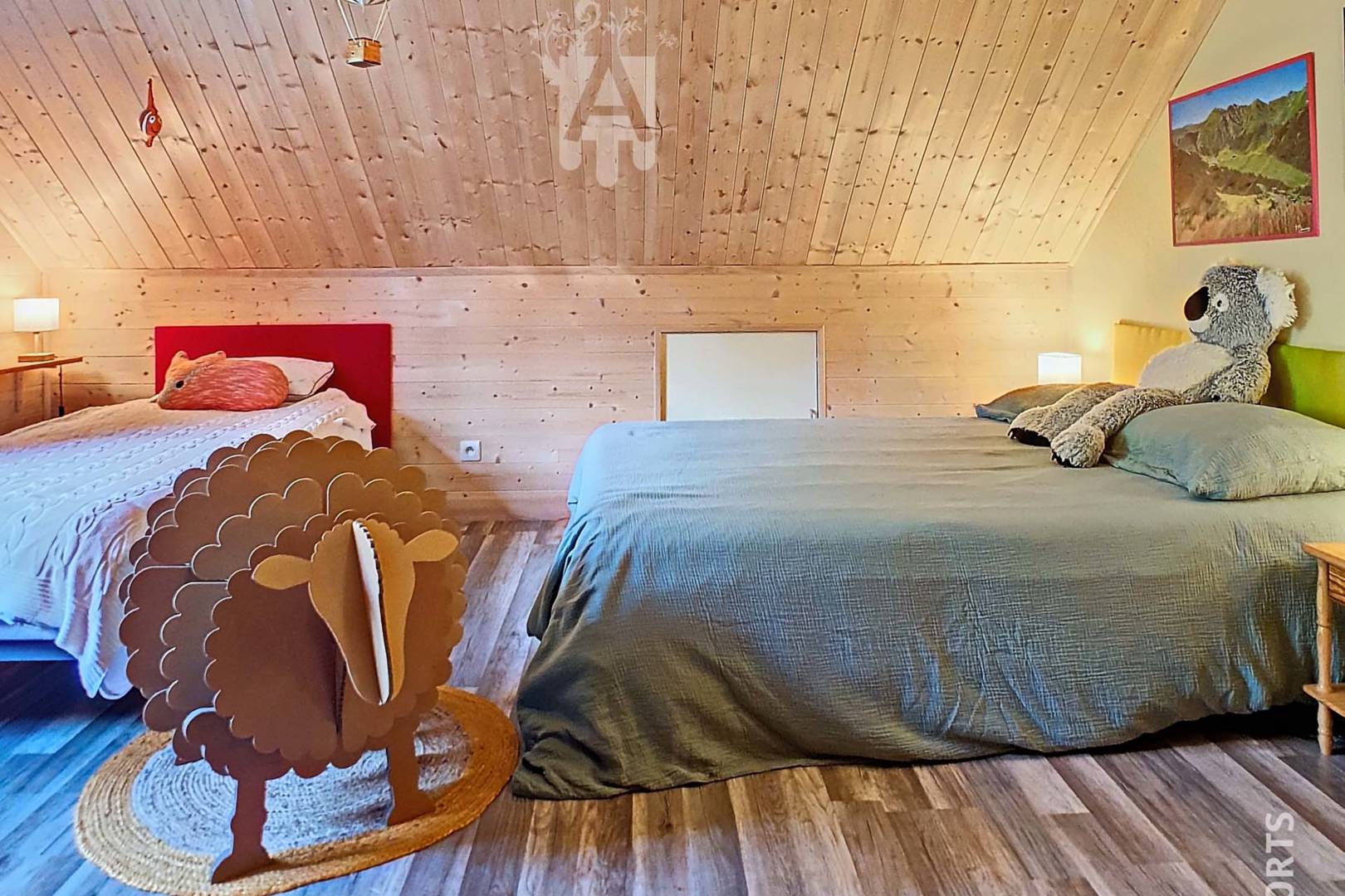 Le petit plus de ce chalet c’est la chambre dortoir, idéale pour les familles, avec deux lits simples de 90 cm, un lit de 120 cm, un lit de 140 cm et un lit à barreaux pour bébé, garantissant un espace de sommeil confortable et un terrain de jeu pour tous les âges.