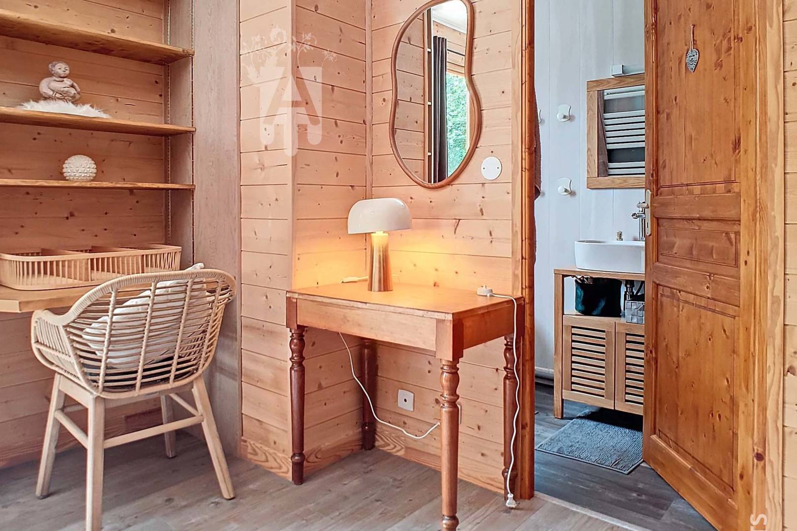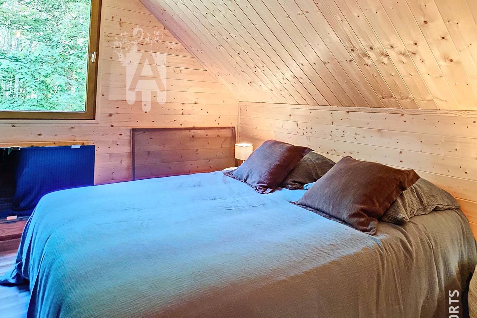A l’étage, une chambre accueillante avec un lit de 140 cm et des rangements, offrant un espace de détente idéal avec une vue imprenable sur la verdure.