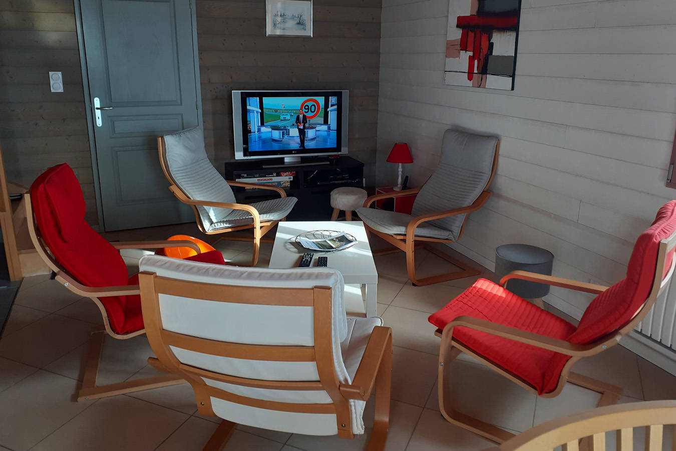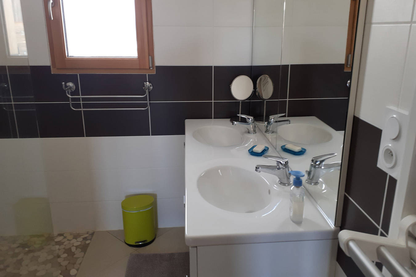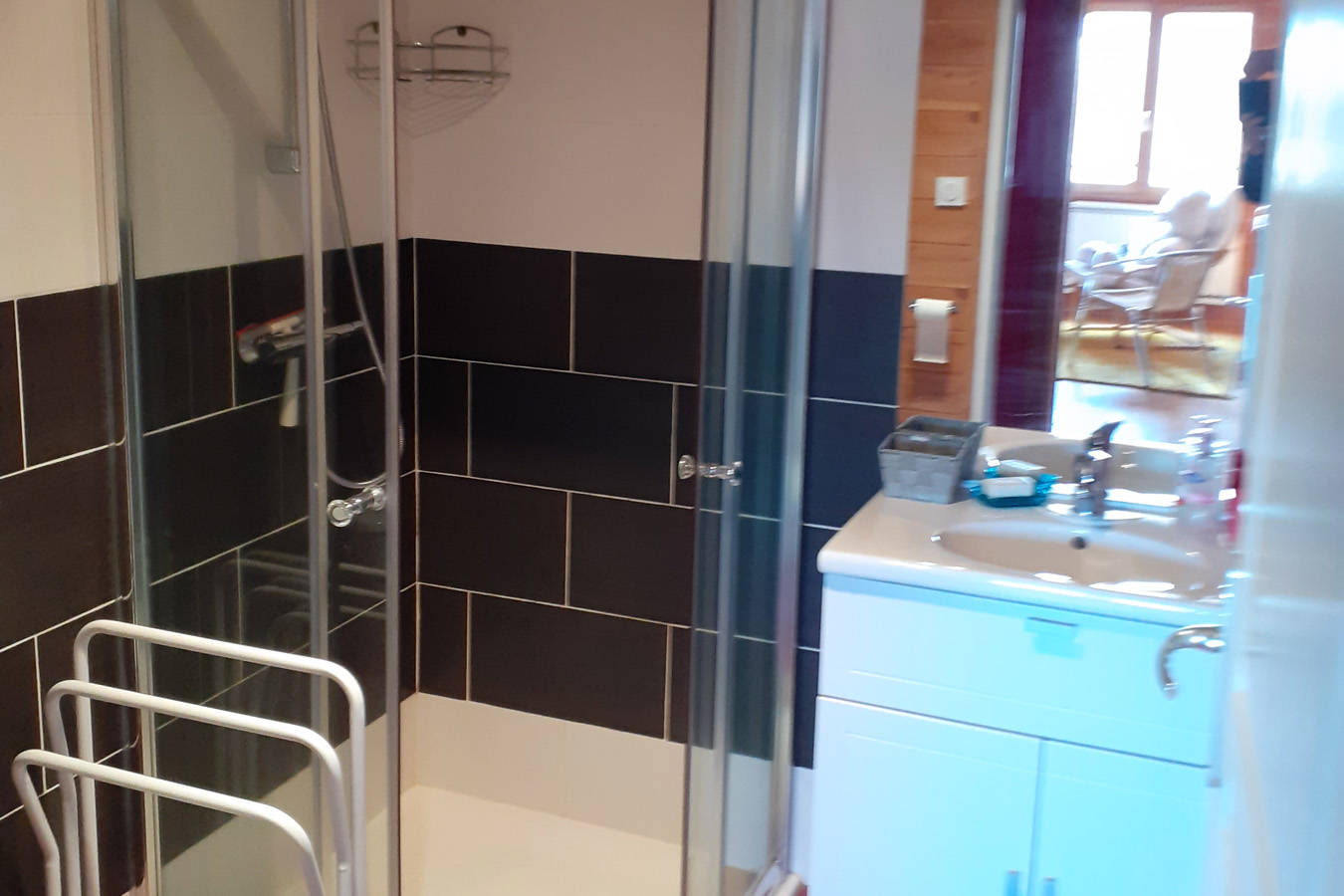 – Un rez-de-chaussée de plain pied (accessible aux personnes à mobilité réduite) avec une entrée (local à skis et penderie), un séjour de 38 m² (salon, salle à manger), cuisine entièrement équipée. Une chambre avec un lit de 160, une salle de bain avec douche à l’italienne, meuble double vasque, un WC et une terrasse de 24 m² avec vue sur la vallée de Chastreix.