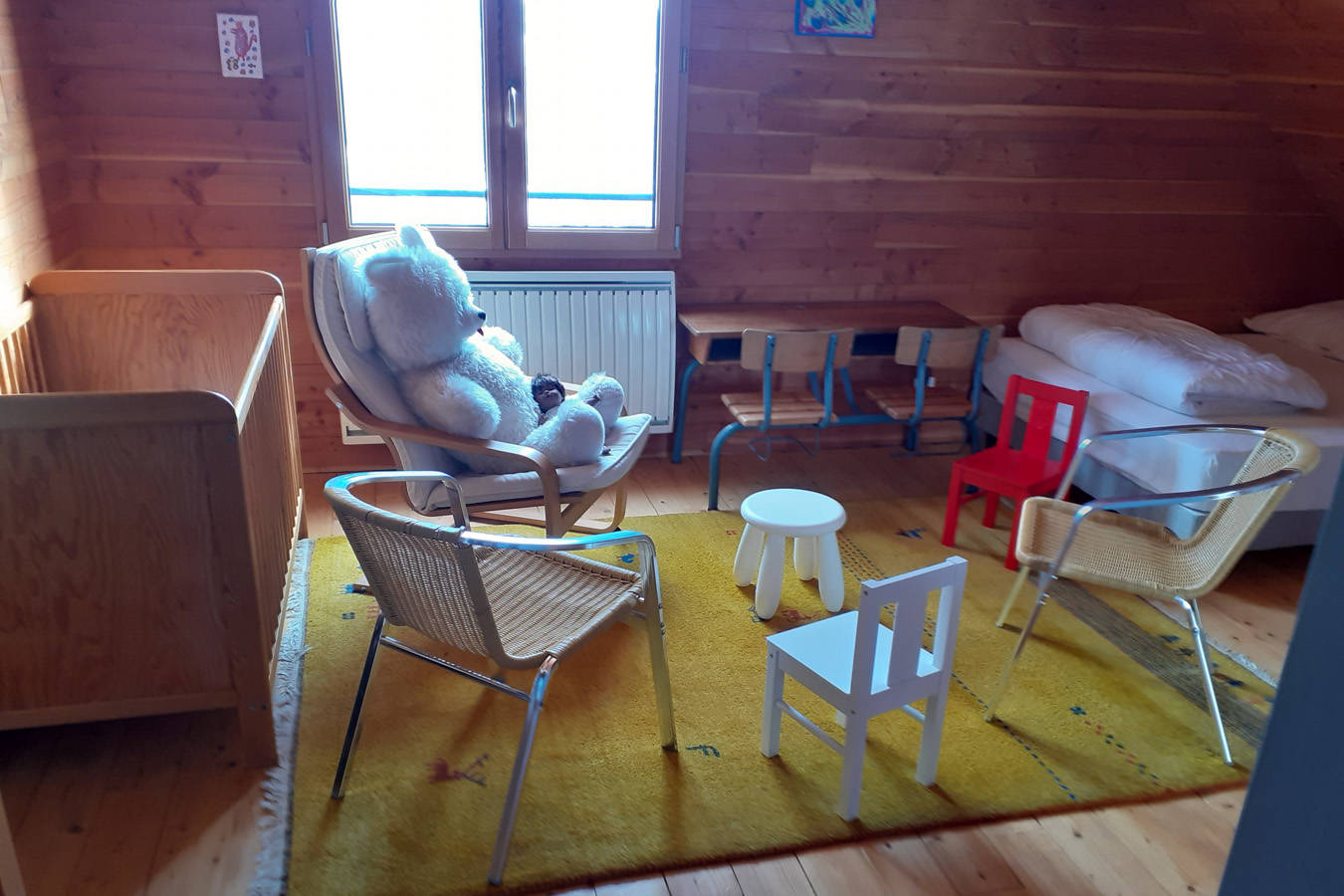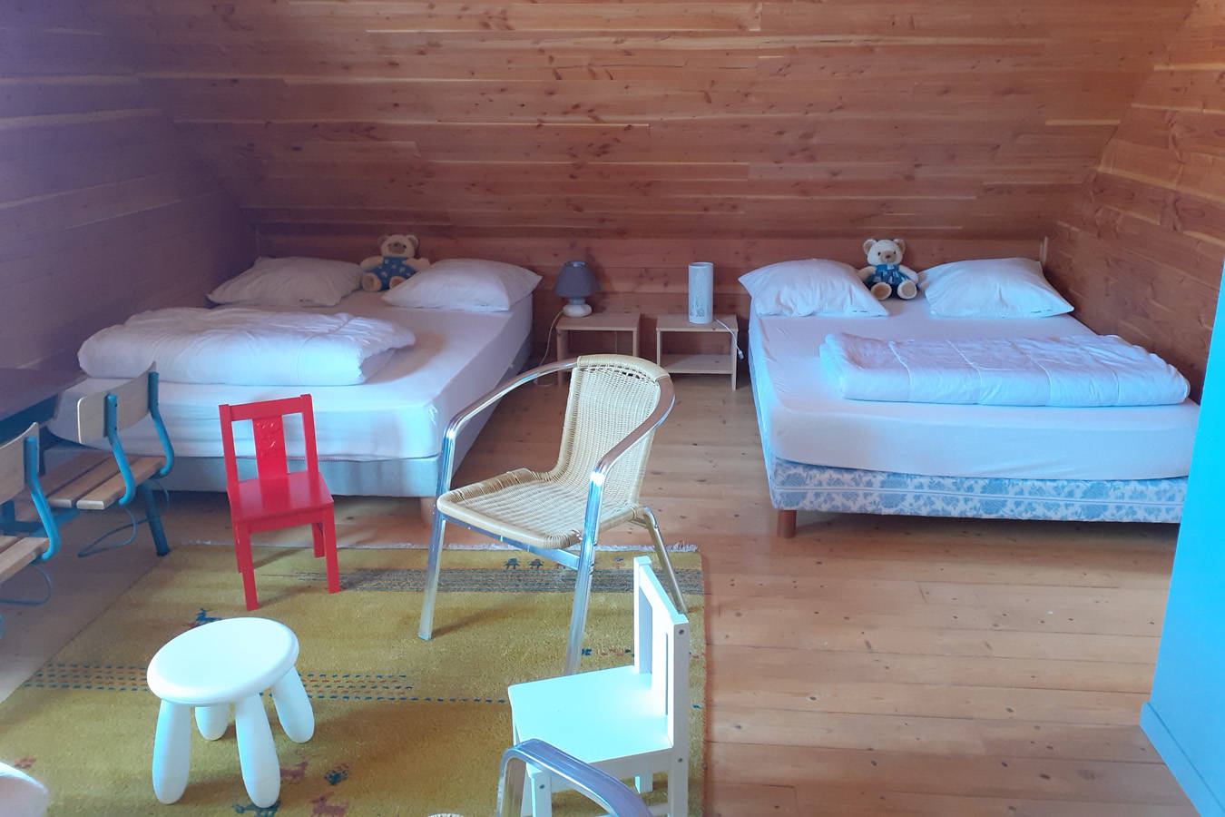 – A l’étage : un « dortoir » ouvert pour enfants avec un lit bébé et deux lits de 140 , deux chambres avec un lit de 160 chacune, une salle de bains avec douche, un WC et une penderie.