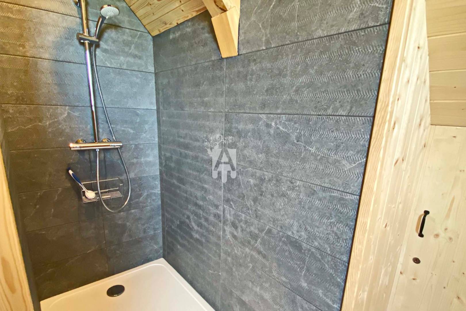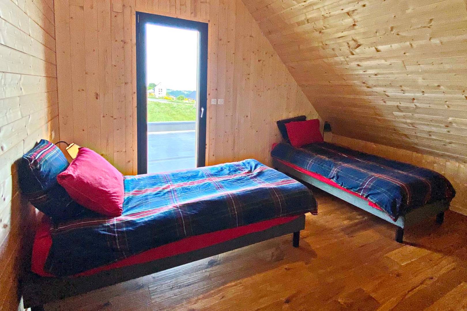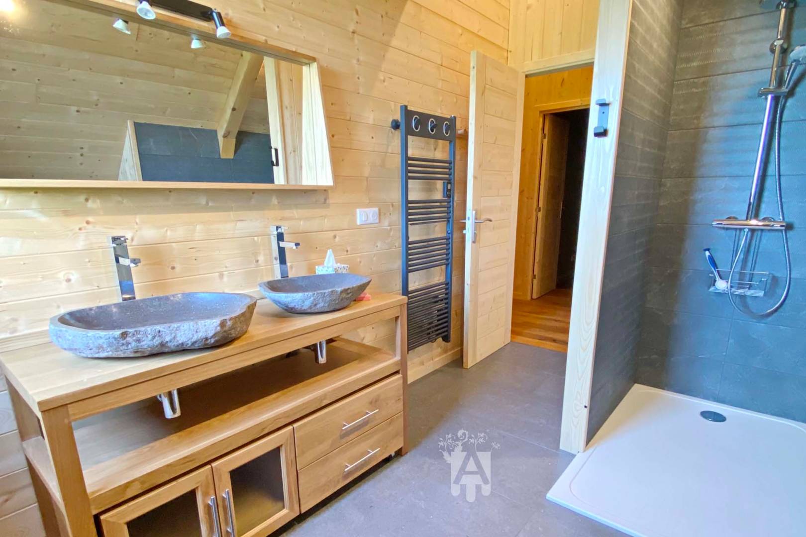 À l’étage, le chalet dispose de 3 chambres supplémentaires, toutes équipées d’un dressing. L’une des chambres est dotée d’un lit double de 160 cm et offre un accès à un balcon commun avec une autre chambre. Les 2 autres chambres sont chacune composées de 2 lits simples de 90 cm, parfaites pour accueillir les enfants ou les amis. Cet étage comprend également une salle d’eau moderne avec une douche à l’italienne et une double vasque ainsi qu’un WC séparé.