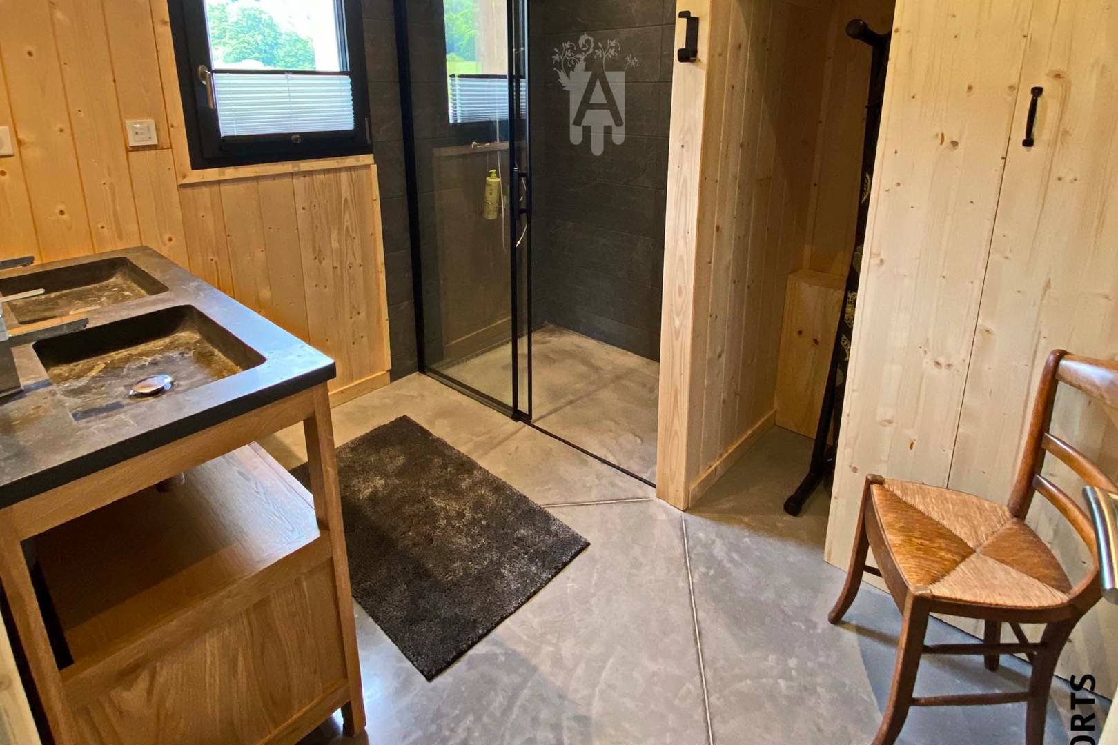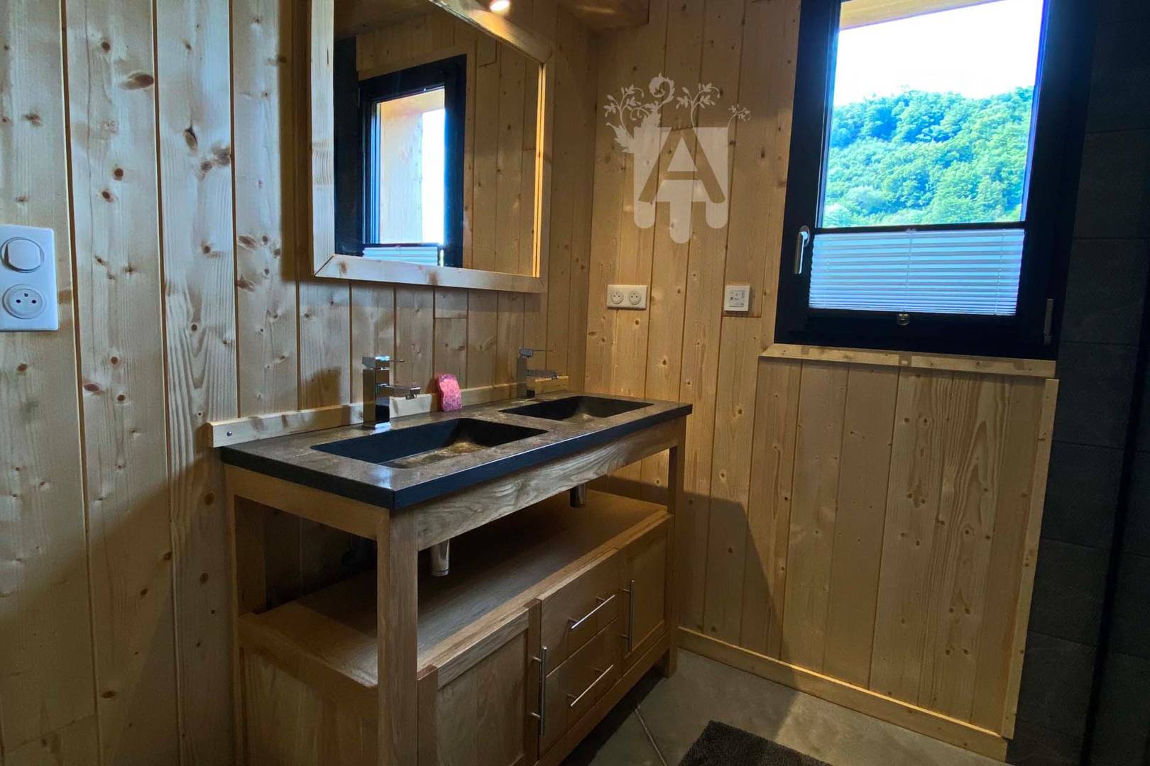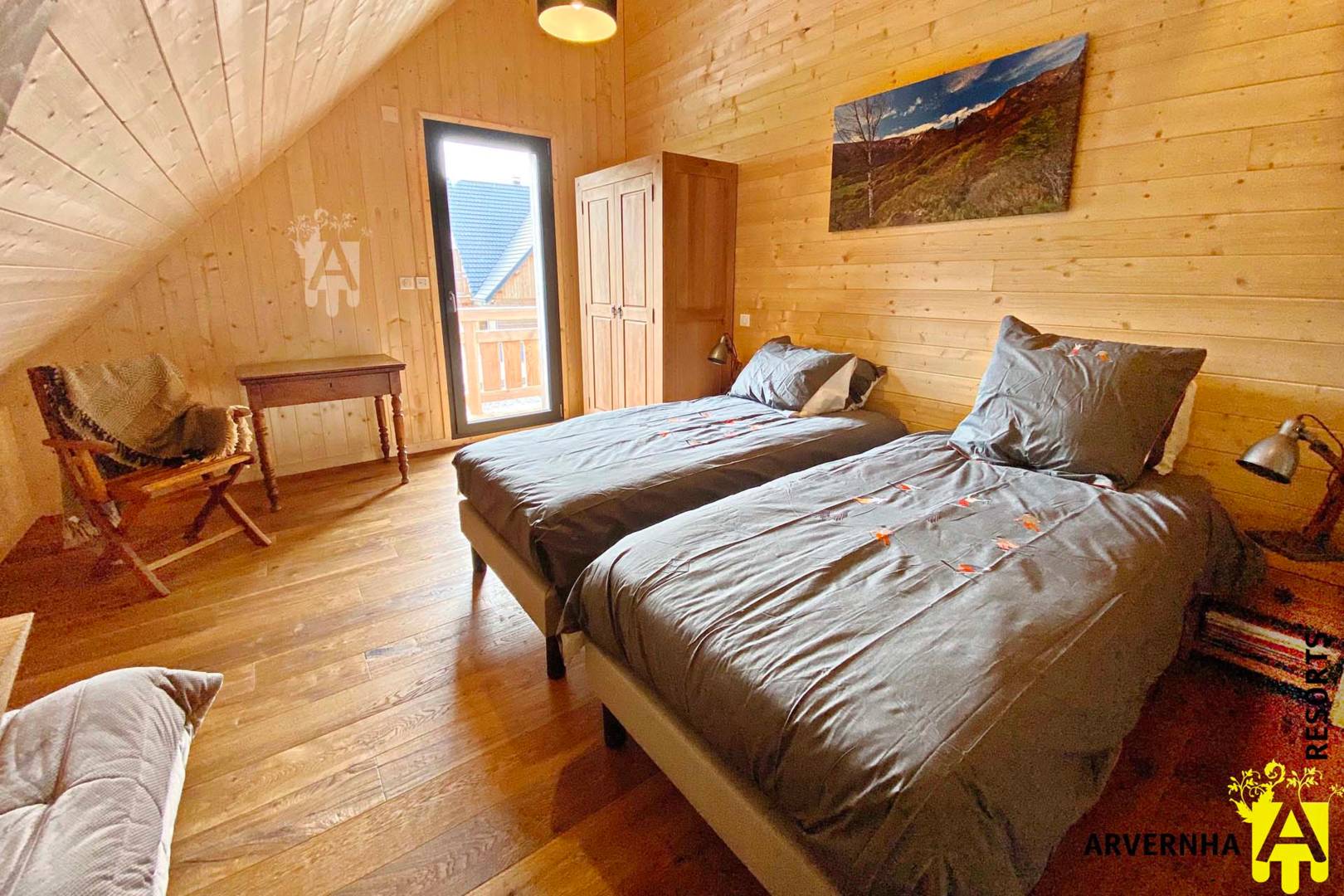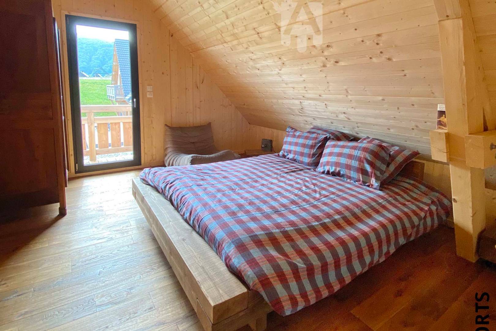À l’étage, le chalet dispose de 3 chambres supplémentaires, toutes équipées d’un dressing. L’une des chambres est dotée d’un lit double de 160 cm et offre un accès à un balcon commun avec une autre chambre. Les 2 autres chambres sont chacune composées de 2 lits simples de 90 cm, parfaites pour accueillir les enfants ou les amis. Cet étage comprend également une salle d’eau moderne avec une douche à l’italienne et une double vasque ainsi qu’un WC séparé.