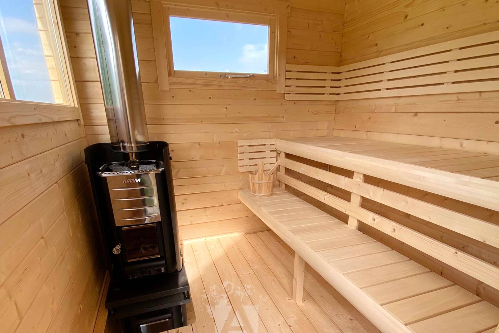 À l’extérieur, une petite cabane abrite un sauna, offrant un espace de détente supplémentaire où vous pourrez vous relaxer après une journée d’exploration ou de randonnée dans les environs.